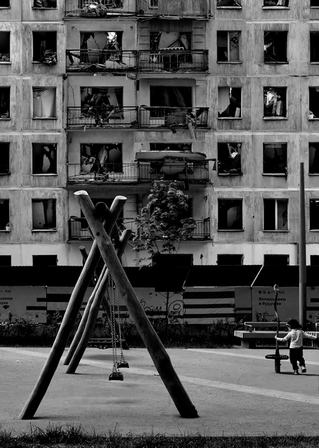 The swings on the playground, like a pendulum in an old clock, do not change amplitudes, rock against the background of a destroyed multistorey house. Everything but swings seemed to be frozen in dead motion. But the occasional appearance of a little girl spinning on a carousel gives hope for a happy continuation of this ringed video.
