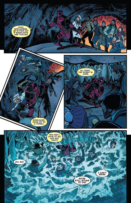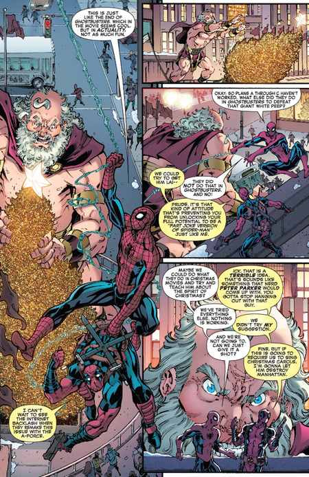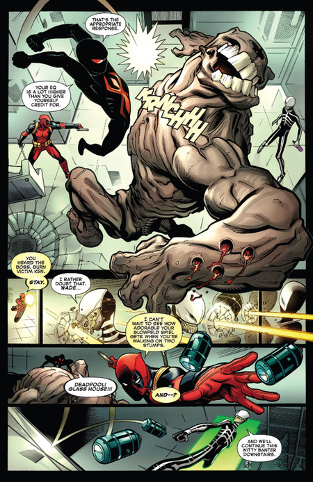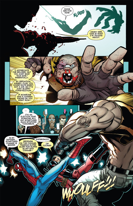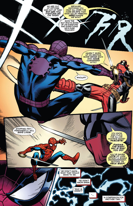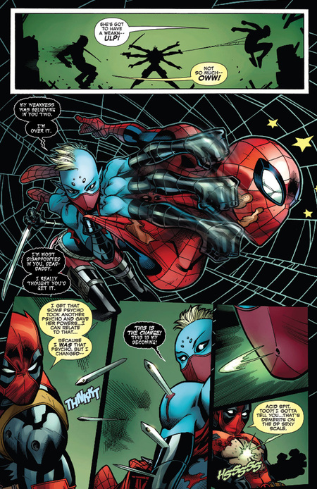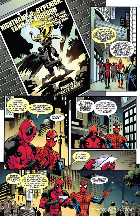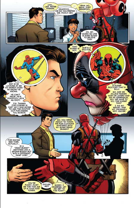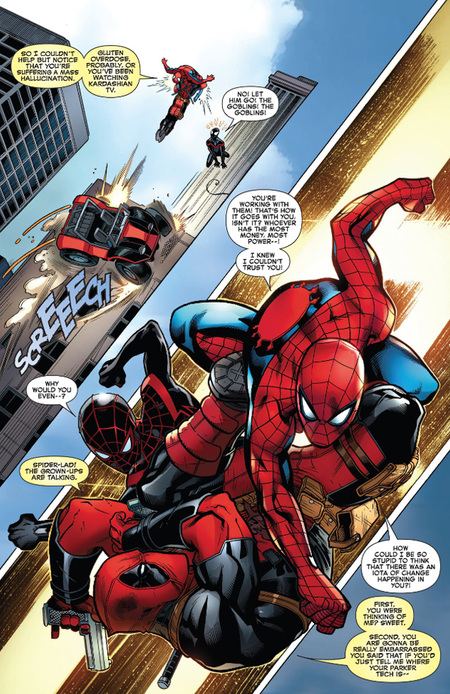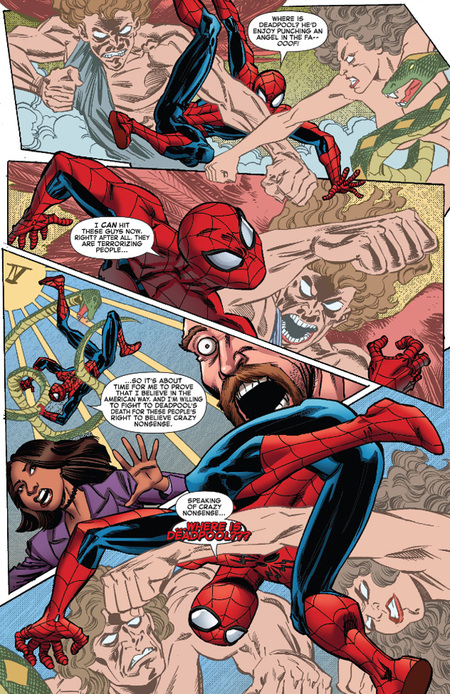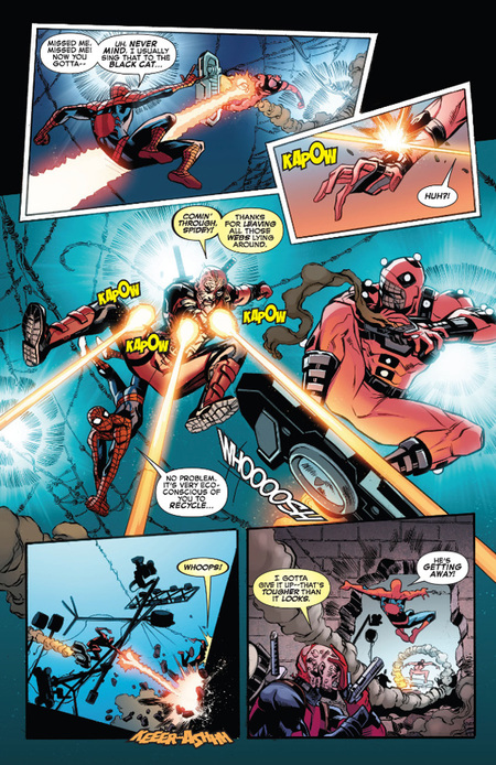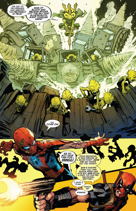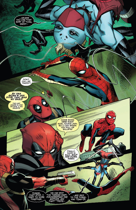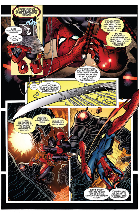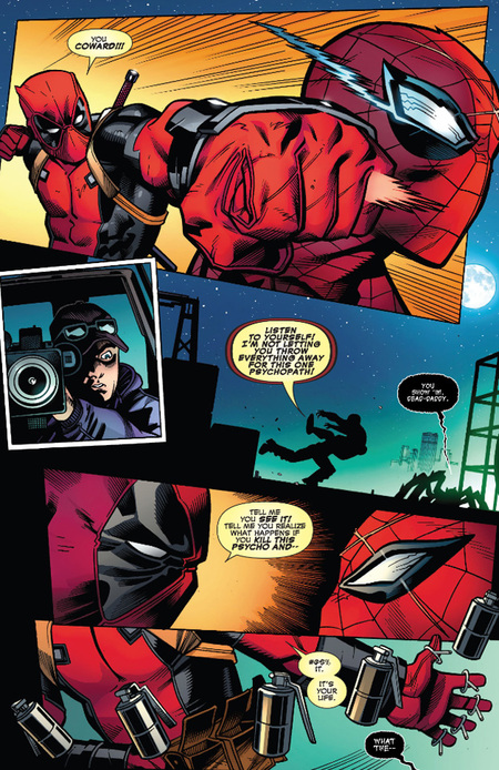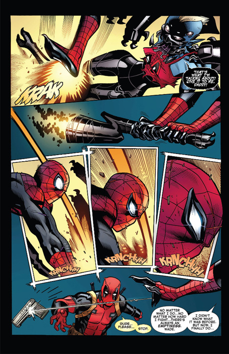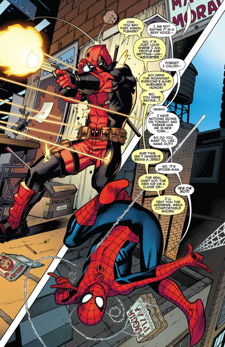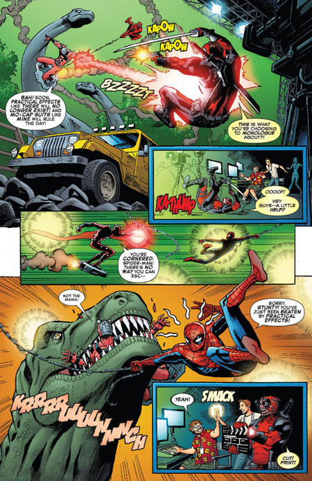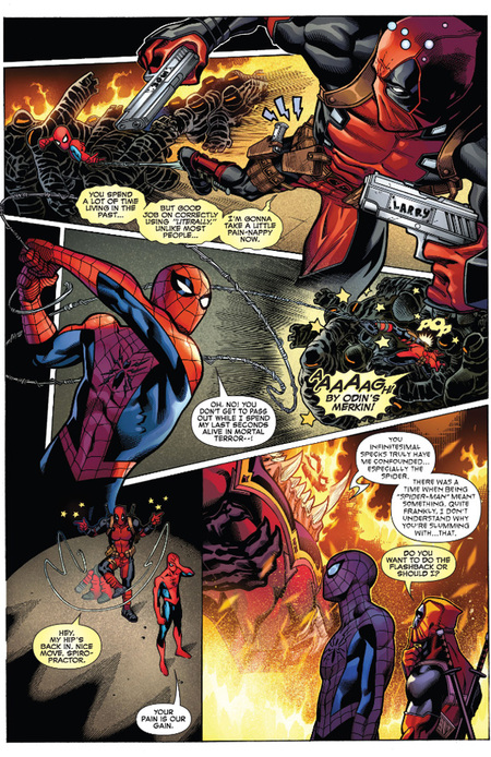Разворотная панель — это возможность для художника показать себя и на полную раскрыть свои навыки. Такой приём нельзя назвать динамичным, ведь фактически это одна большая иллюстрация, однако в этом и суть: когда речь идёт о Человеке-Пауке и Дэдпуле, а иллюстратор знает своё дело, в итоге может получится поистине впечатляющая работа.