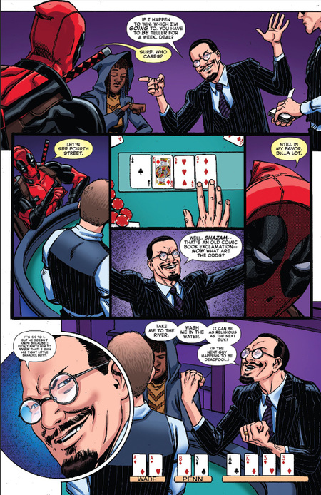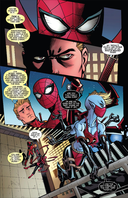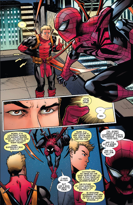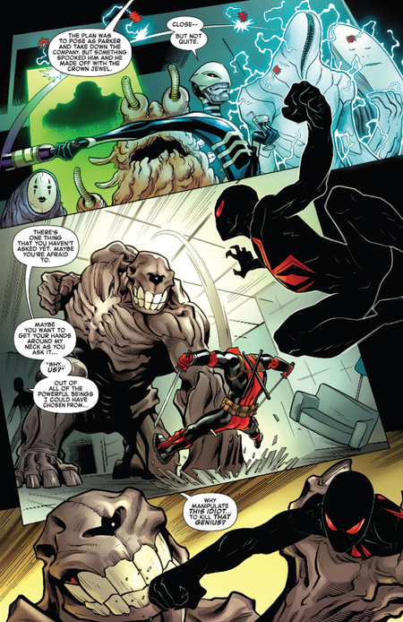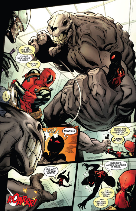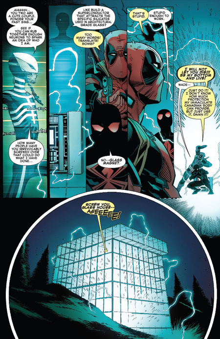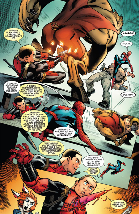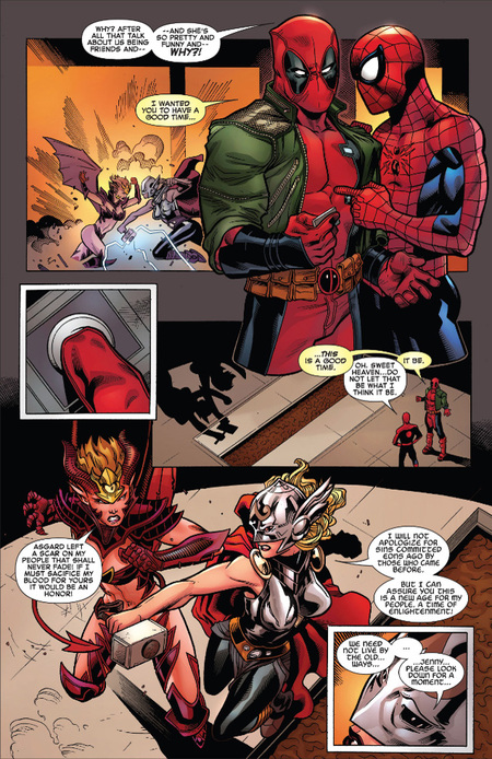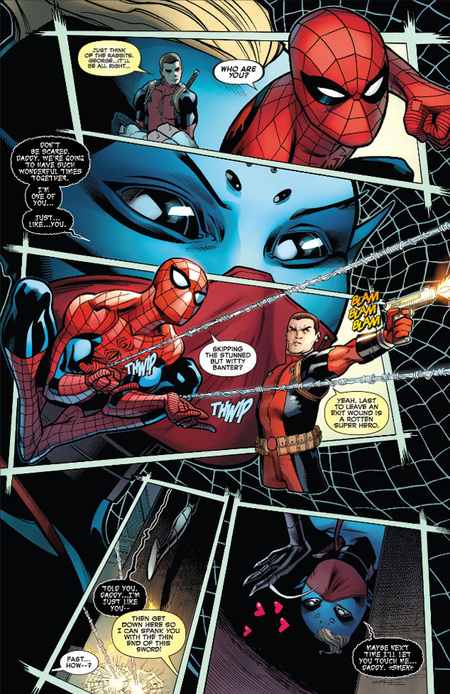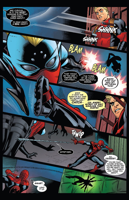 Можно заметить, что в одной истории легко сочетается несколько способов акцентирования панелей. В весьма активное взаимодействие Человека-Паука и Дэдпула гармонично вплетается изменение как формы, так и цвета и расположения рамок — всё это делает комикс эмоциональным и насыщенным.