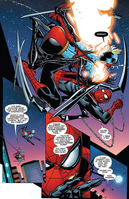 Конечно же, невозможно не затронуть тему сражений. В этом случае перекрытие и наложение панелей могут отражать хаотичность движений персонажа, а также передавать их количество (например, как каскад ударов Человека-Паука на развороте ниже). Это тоже прекрасно усиливает напряжение и динамику сцены.