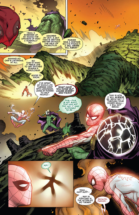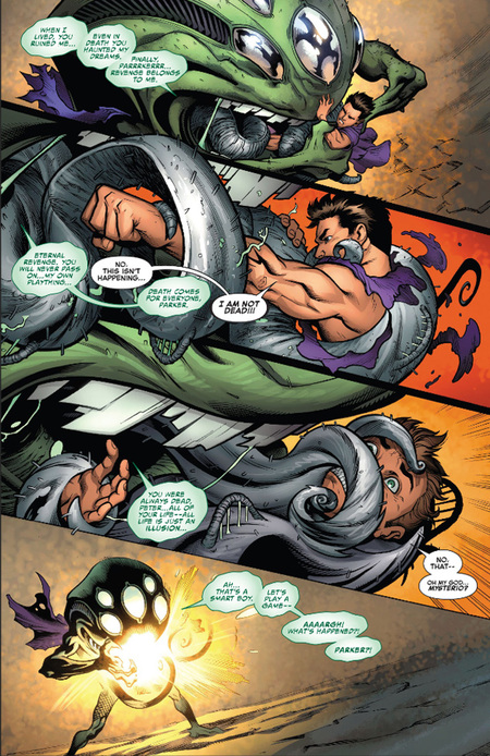 Например, как на разворотах ниже, привычную форму рамок заменяет паутина. Из того, как плавно границы фреймов вытекают из маски Человека-Паука, получается практически цельная иллюстрация, отражающая поток мыслей героя.