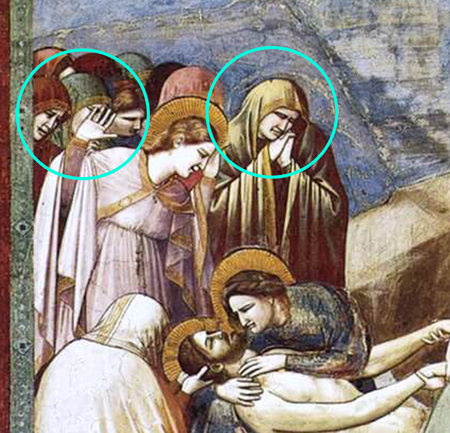 Выражение лиц также играют важную роль в передаче эмоций. Хотя лица еще не близки к индивидуальности, Джотто старается ввести обособленные эмоции: например, напряженные брови и сведенные глаза. Это первые попытки передать психологическое состояние, а не символический образ. Также Джотто смягчает цвета, делает их более земными и тяжелыми. Это помогает подчеркнуть эмоциональную плотность сцены.