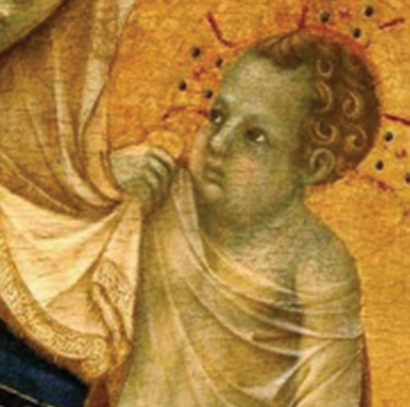 На картине можно увидеть, как младенец касается плата Мадонны, а ангелы не просто предстоят, а созерцают ребенка и мать. Этот жест показывает, что в картине начинают появляться больше человеческих чувств, хотя общий стиль остается все также строгим и традиционным. Художник сохраняет нимбы и золотой фон, что показывает знаки святости, но добавляет в картину общение между персонажами. Таким образом Дуччо ди Буонинсенья балансирует между старыми правилами и новыми идеями, делая изображение более эмоциональным.