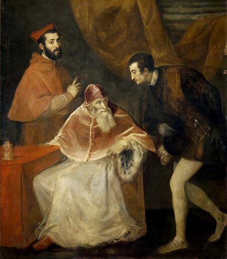 Тициан — «Портрет папы Павла III» (1543) Тициан — «Папа Павел III с племянниками» (1545-1546)