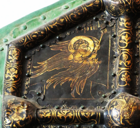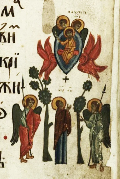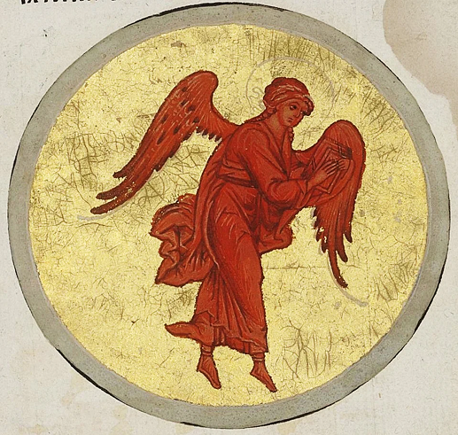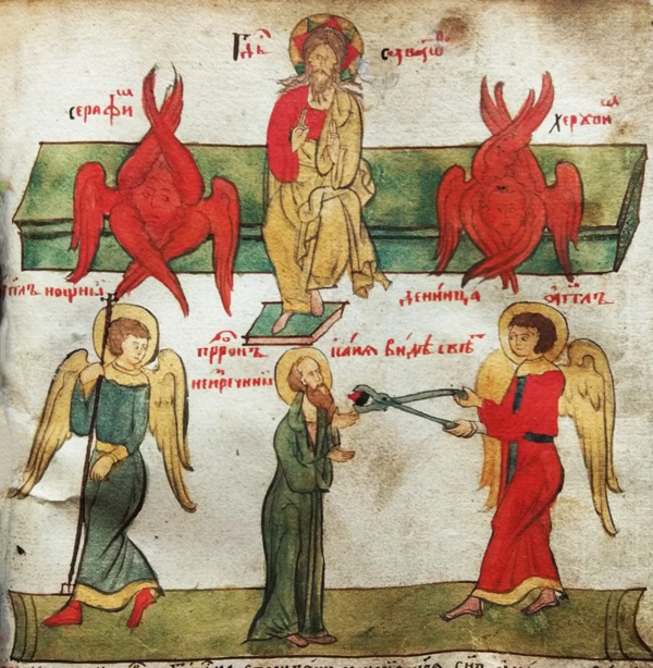 Ангел касается уст Исайи горящим углем. Изображения двух огненных шестикрылых существ, подписанных как «серафим» и «херувим»; Вознесение Христа на двух огненных четырехкрылых херувимах