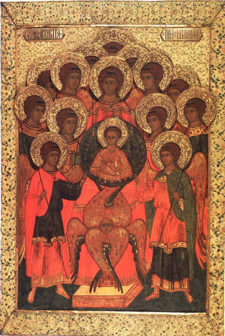 Серафимы, Херувимы и Престолы — это высший чин, приближенный к богу. В своей книге «О небесной иерархии» Дионисий описывает ангелов такими, какими они предстают в Ветхом и Новом Завете. Однако из-за сложности описания божественных созданий их вид постепенно менялся для более легкого восприятия