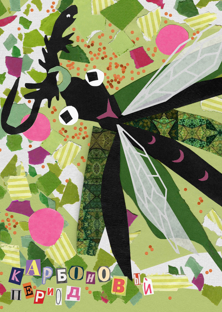 Иллюстрация древней гигантской стрекозы, пожирающей рептилию. Работа выполнена методом ручной аппликации, постобработка проведена в графических редакторах.