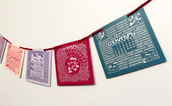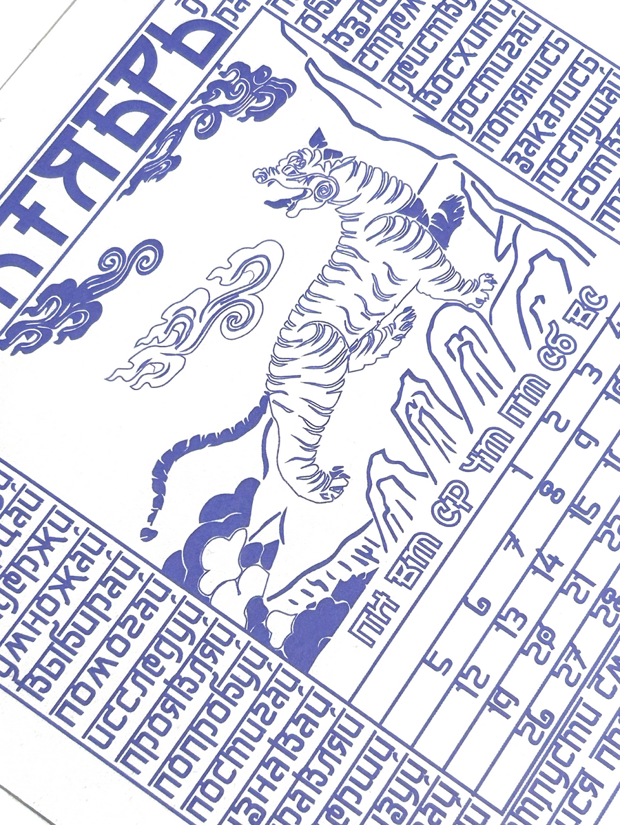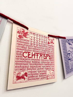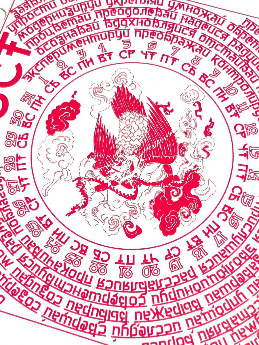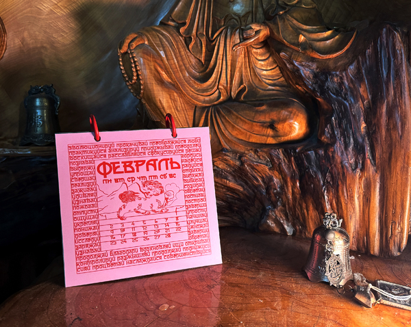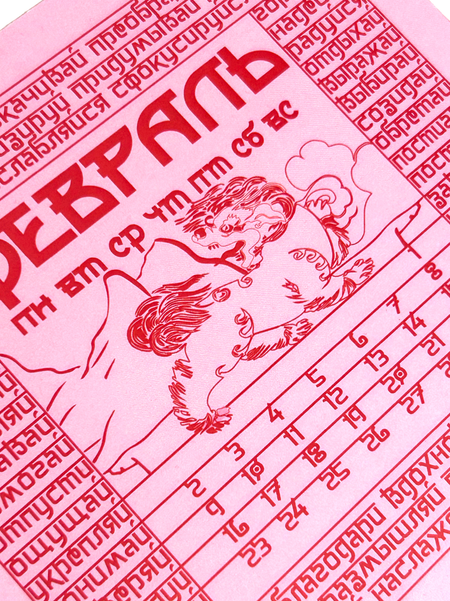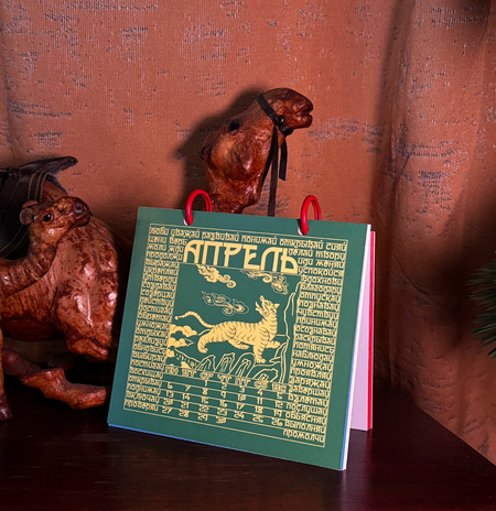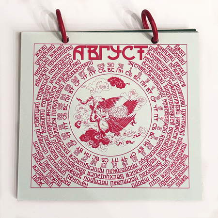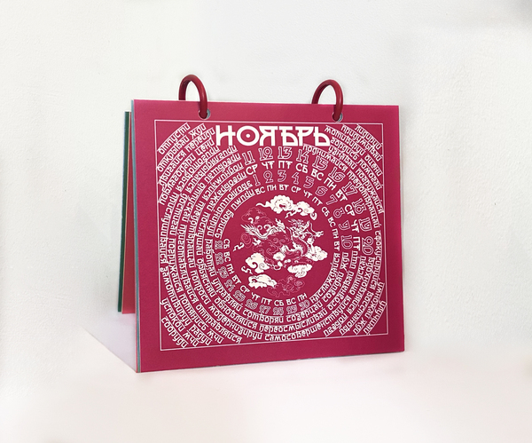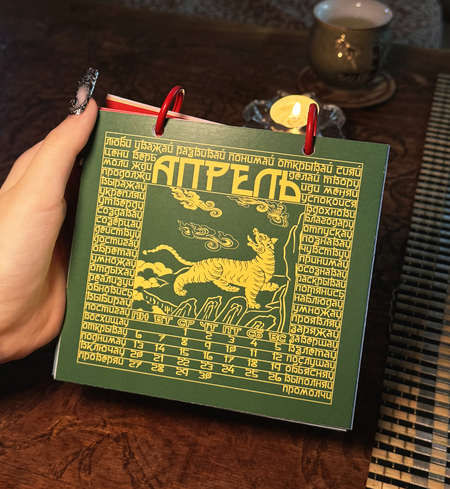 В календаре вместо молитвы — побудительные глаголы. Отмечая дату, человек непроизвольно замечает слово, которое станет мотивом дня или заставит задуматься о жизненном пути. На каждом месяце отрисованы духовные животные.