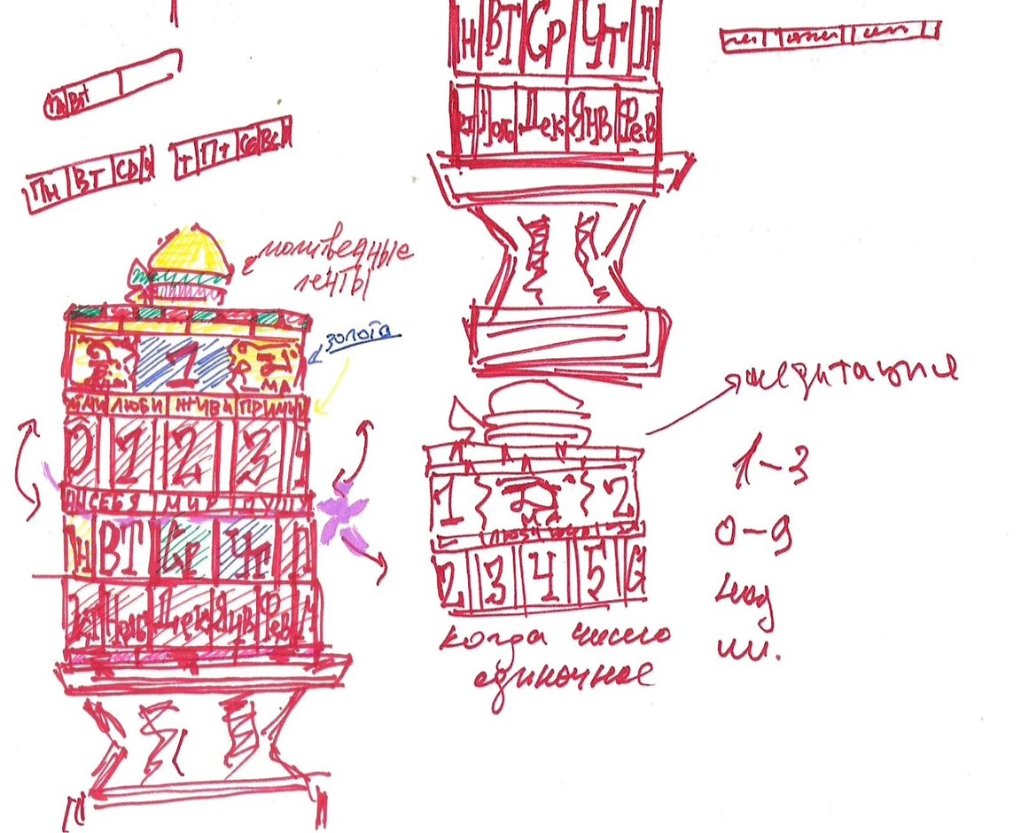 Он направлен на физическое взаимодействие. Каждая секция крутится, человек самостоятельно выстраивает дату, что делает календарь бесконечным.