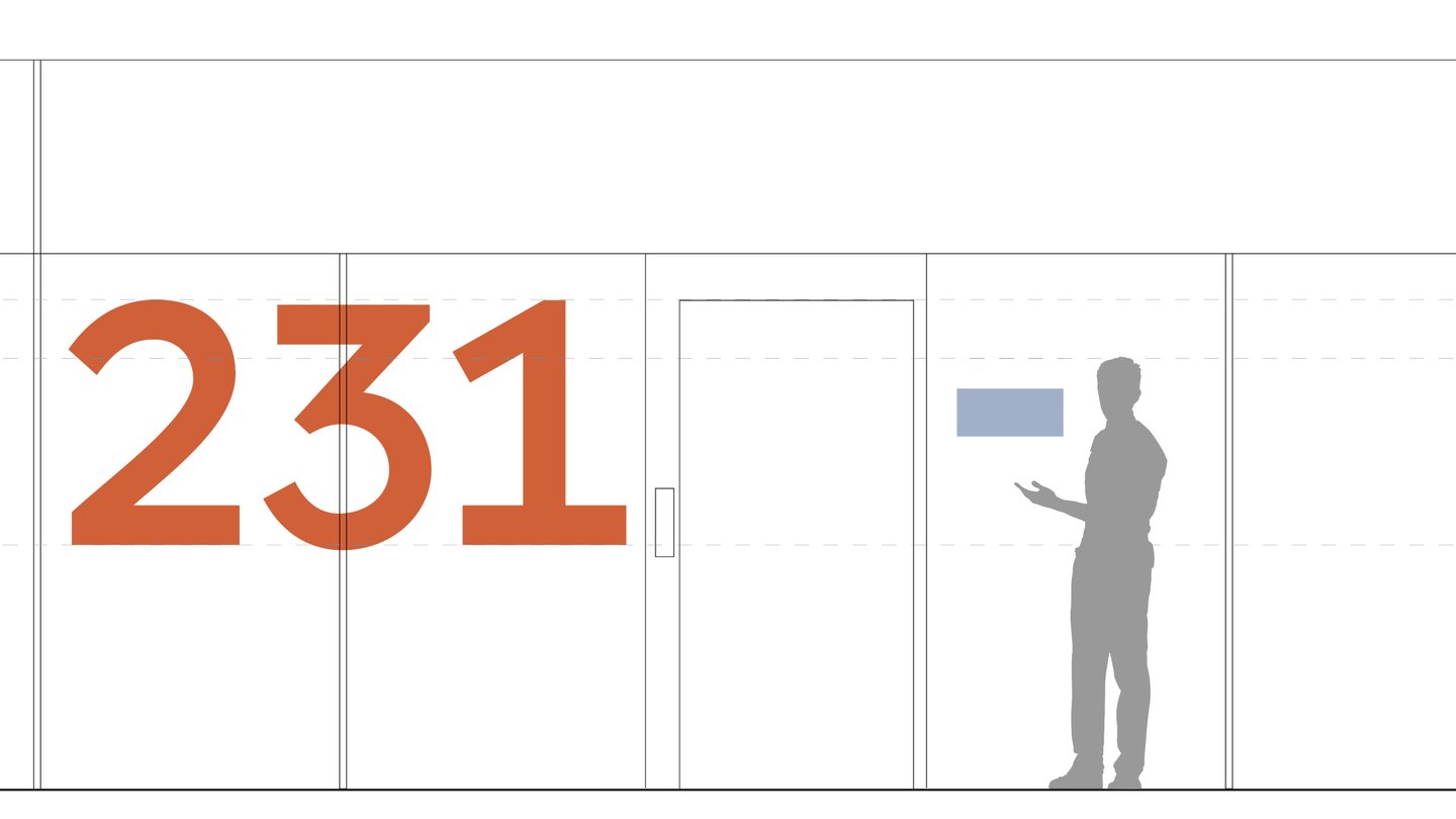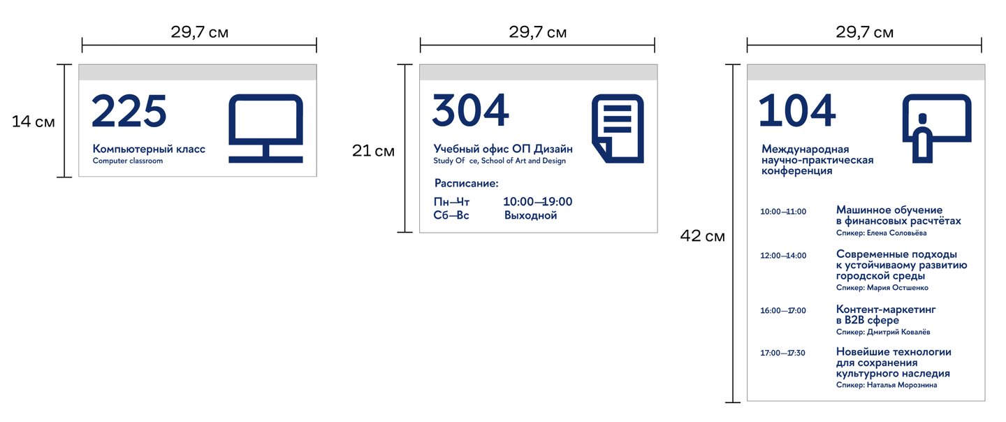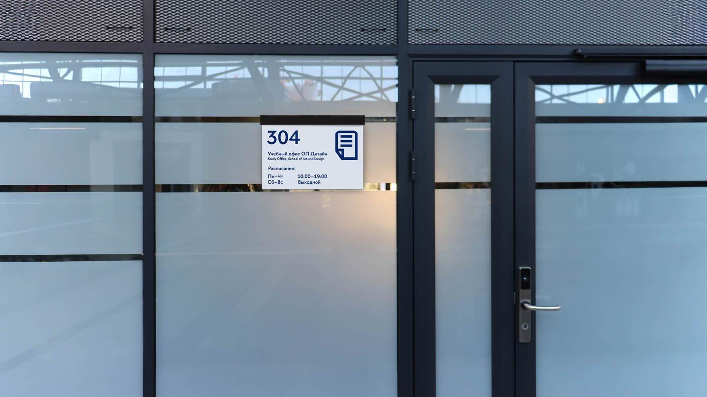 Чтобы выделить аудитории с мероприятиями из числа остальных, предлагается использовать крупные номера и слова-маркеры. В качестве гарнитуры могут быть использованы фирменные шрифты мероприятий. Для событий, связанных со Школой дизайна, предлагается использовать шрифты, разработанные студентами Школы дизайна