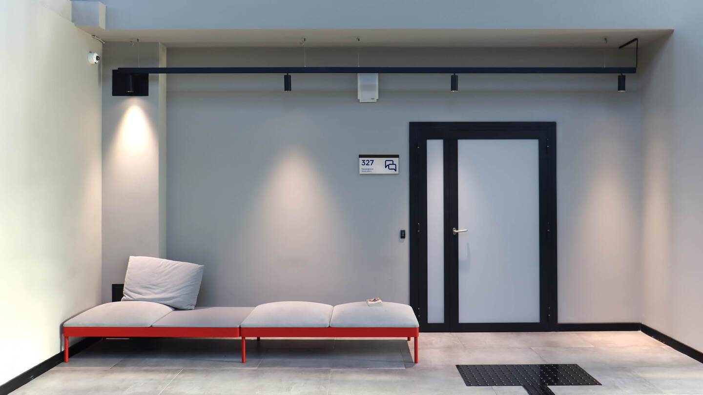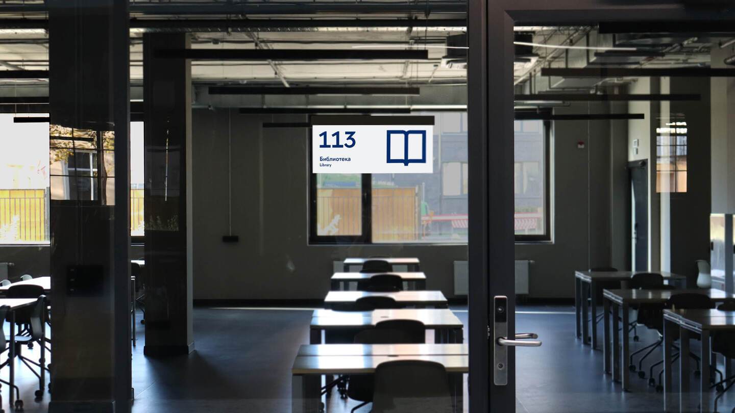 Второй важной составляющей являются информационные точки: таблички у аудиторий и доски объявлений. Для них используется конструкция направляющей панели с Т-образным вырезом, предназначенным для пластиковых холдеров или прищепок