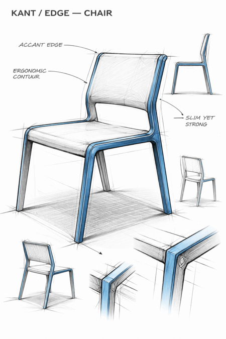 Кант проходит от спинки через сиденье к опорам, формируя жёсткую раму и одновременно задавая эргономичный изгиб. Стул предназначен для повседневного использования и демонстрирует базовый язык бренда.