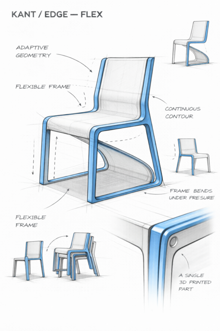 Кант здесь становится упругой рамой, работающей на изгиб. Flex не использует мягкие материалы — комфорт достигается за счёт адаптивной геометрии и переменной толщины конструкции.