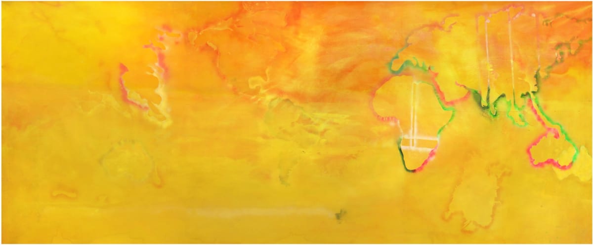 В картине Texas Louise (1971) силуэт континента служит оправой для чисто живописных экспериментов. На фоне льющихся и размытых цветовых потоков угадывается контур Северной Америки. В отличие от строгой картографии, здесь отсутствует центр и иерархия: пространство «плывёт» и диффузно растворяется. «Texas» в названии может отсылать и к месту, и к состоянию — определяется скорее эмоционально, чем географически. Картина работает с идеей того, что территориальная принадлежность и национальная идентичность не фиксированы, а подвижны и субъективны.