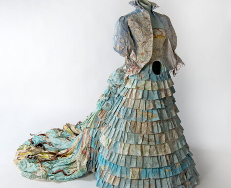 Territory Dress (2018) — это скульптурное платье, в котором карты становятся одновременно материалом и носителем смысла. В работе используются бумажные карты, включая карты бывших колоний, а также текстиль и дополнительные элементы, такие как проволока или коллажные вставки. Платье превращает тело в «территорию», переосмысливая географические и политические структуры через призму женского силуэта и вопросов гендера, власти и колониального наследия. Сквозь скрытые детали — например, фрагменты карт или бумажные лодки, помещённые внутри пояса — проявляется тема миграции, торговли и колониальных маршрутов. Визуально работа балансирует между декоративностью и тревожностью: фактура, текстура и сочетание материалов подчеркивают сложное взаимодействие эстетики и концептуального посыла, создавая эффект плотного, многослойного нарратива.