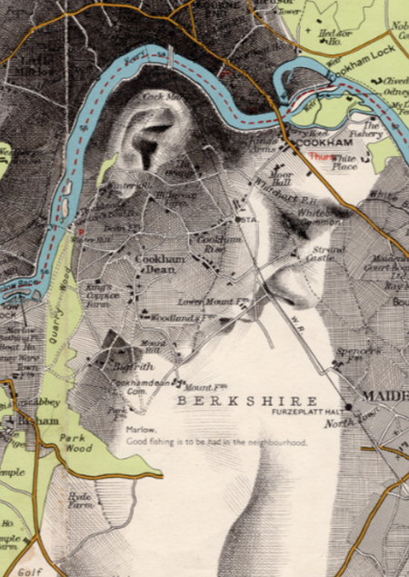В работе River Thames, Marlow to Maidenhead (2024) Эд Фэрбёрн трансформирует фрагмент исторической карты Темзы в портретную композицию, используя графическую инфраструктуру карты как основу для изображения человеческого лица. Художник интегрирует топографические элементы — русло реки, линии рельефа, дорожную сеть и границы населённых пунктов — в анатомическую структуру портрета, создавая эффект двойного прочтения: территория одновременно воспринимается как географический объект и как фигуративный образ. Фэрбёрн демонстрирует потенциал картографии как художественного материала: карта перестаёт быть нейтральной схемой и становится пространством визуальной интерпретации. Взаимосвязь между ландшафтом и портретом актуализирует тему человеческого присутствия в пространстве и подчеркивает символическую взаимозависимость человека и среды. Работа функционирует как исследование того, как документальная картографическая структура может превращаться в носитель эмоции, идентичности и культурной памяти.