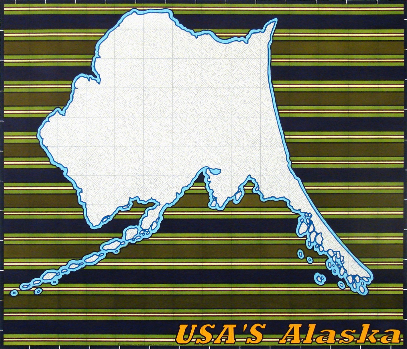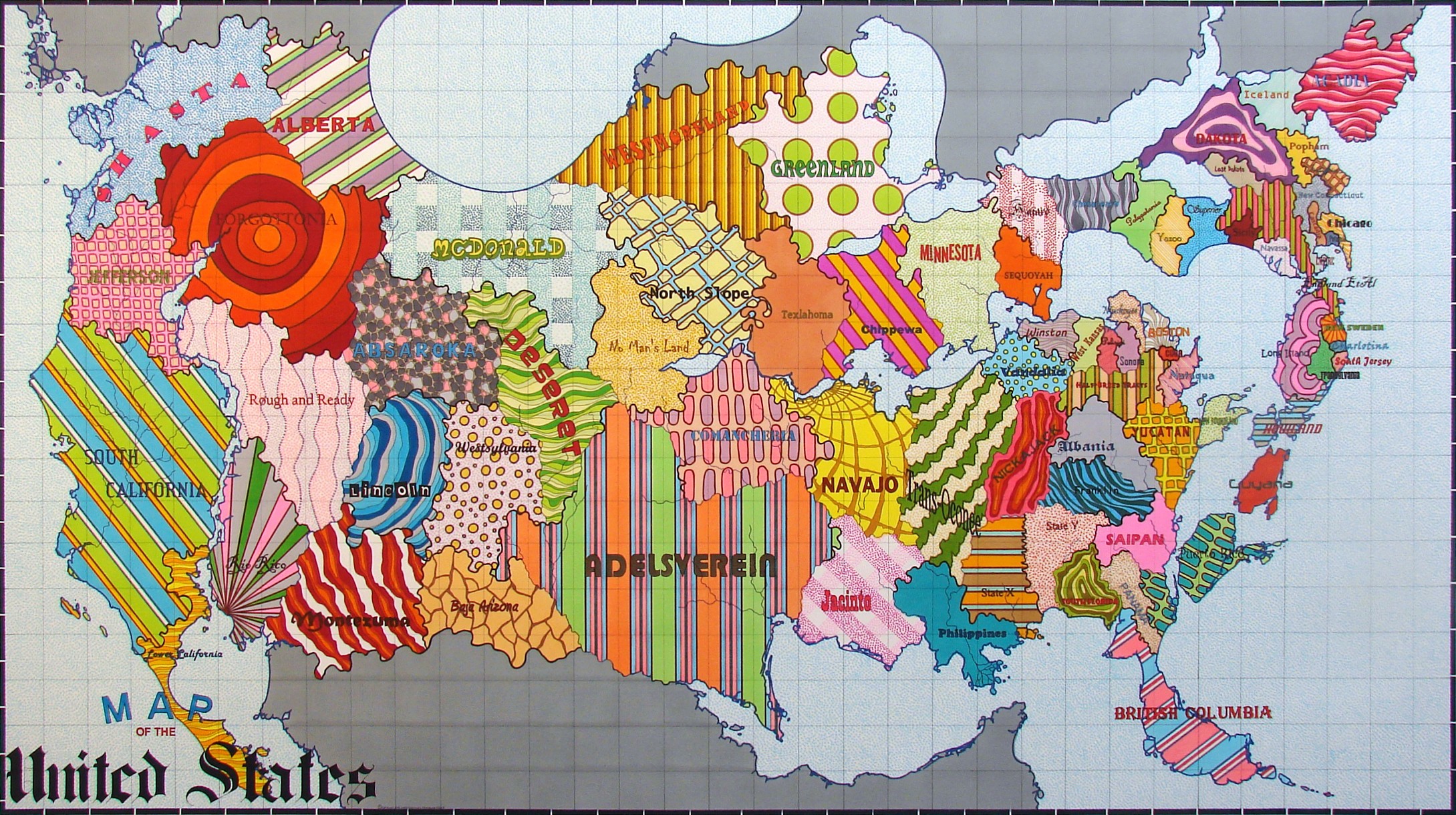 В работе United States Map II (Not States) (2010) Лорди Родригес радикально переосмысливает картографическое изображение США, разрушая привычный порядок административного деления. Вместо официальных штатов он заполняет карту исторически возможными, утопическими или забытыми названиями территорий, такими как Absaroka, Deseret, Texlahoma, Rough and Ready, Lincoln, Greenland, и даже визуальными аллюзиями на корпоративные или культурные бренды — например, McDonald. Каждая территория отмечена уникальным орнаментом, напоминающим текстильные принты, графические паттерны или рекламный дизайн: полосы, круги, волны, клетка. Эти визуальные маркеры не просто украшают карту, но и подчеркивают множественность культурных идентичностей, конкурирующих внутри национального пространства. Работа создает иллюзию узнаваемого географического контура США, но одновременно подрывает его устойчивость: привычная национальная карта трансформируется в фантазийный коллаж возможных исторических сценариев, конфликтов интересов и альтернативных политических проектов. Отказ от официальных названий превращает карту из инструмента власти — в поле игры и воображения, где границы утрачивают свою объективность. Зритель сталкивается с вопросами о том, кто формирует картографическую истину и почему история складывается именно так, а не иначе.