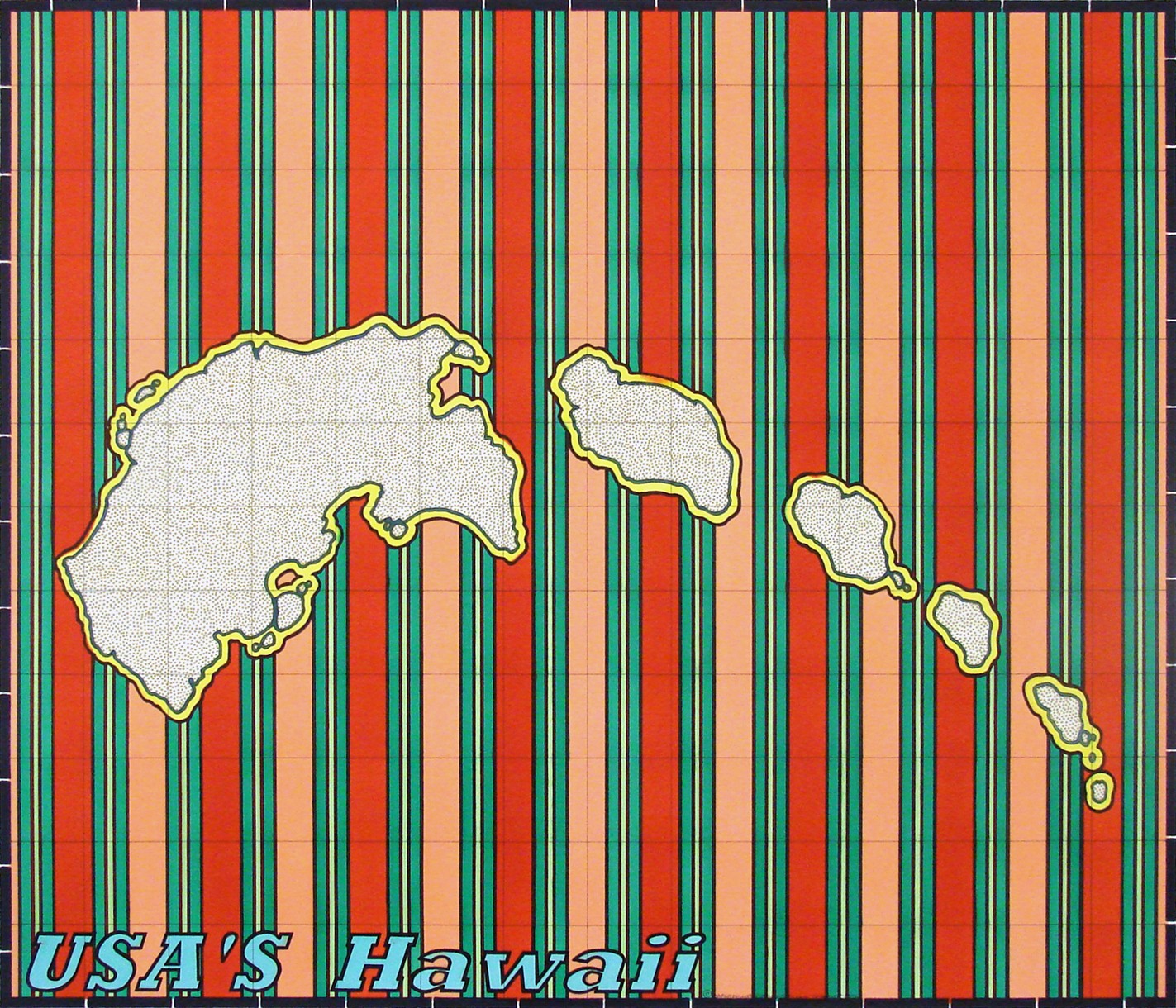 В работе USA’s Hawaii Лорди Родригес переосмысляет место Гавайских островов в картографическом и культурном пространстве США. На изображении архипелаг предстаёт как ряд белых силуэтов островов с точечным внутренним заполнением, окружённых ярким контуром. Эти географически узнаваемые формы помещены на полностью абстрактный фон, состоящий из вертикальных полос насыщенных цветов — красного, оранжевого, бирюзового и зелёного. Схематичность оформления островов и отсутствие привычных топографических данных — названий, рельефа, инфраструктуры — превращают Гавайи в символ, визуальный знак. Ярко выраженная орнаментальность фона связывает работу со стилистикой рекламной графики, текстиля и поп-арта, внося элемент искусственности в восприятие территории. Такое решение подчёркивает противоречие в статусе Гавайев: географически удалённые, исторически и культурно самобытные, они нередко воспринимаются как экзотический курорт или «туристический бренд», а не как полноценный субъект национальной идентичности США. Традиционная картография здесь заменена эстетизированным образцом, в котором пространство страны превращается в продукт визуального потребления.