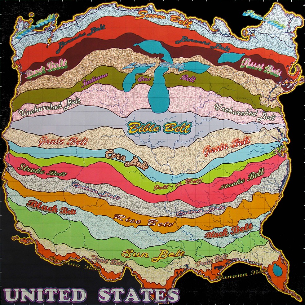 В работе United States Map III (The Belts) Лорди Родригес преобразует карту США в систему культурных, экономических и исторических зон, известных как «пояса» (belts). Вместо традиционных государственных границ художник вводит абстрактные слои, которые пересекают привычное картографическое пространство, подчеркивая, что идентичность регионов формируется не административной логикой, а социокультурными процессами. На карте обозначены широко распространённые и стереотипизированные пояса — Bible Belt, Corn Belt, Rust Belt, Black Belt, Sun Belt, Grits Belt, Stroke Belt и другие — зоны, которые существуют преимущественно в общественном сознании и в культурно-историческом дискурсе, но не имеют официального статуса. Их расположение и масштаб подаются условно, как метафорические нашлёпки на географии страны. Родригес использует яркие графические паттерны, насыщенную палитру и стилизованную типографику, что превращает карту в визуальную панораму стереотипов и коллективных представлений. Форма США делается округлой и уплотнённой, будто страна приобретает новое символическое тело, где зоны влияния накладываются друг на друга.
