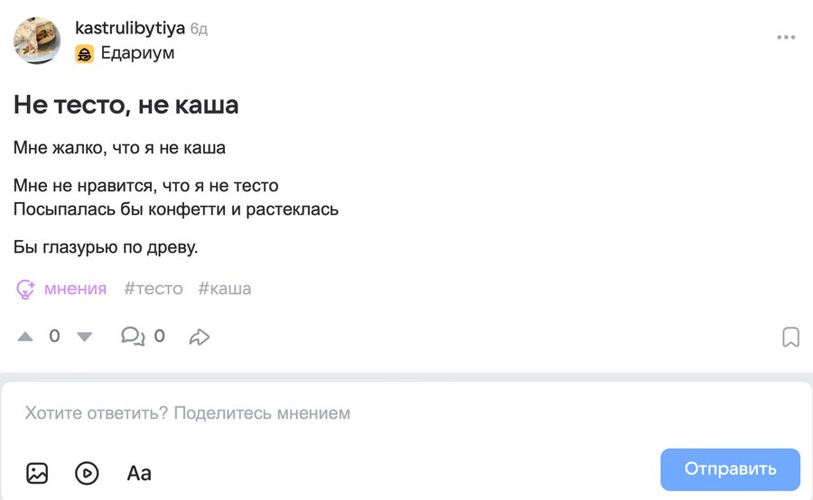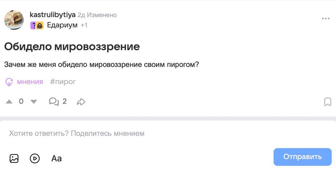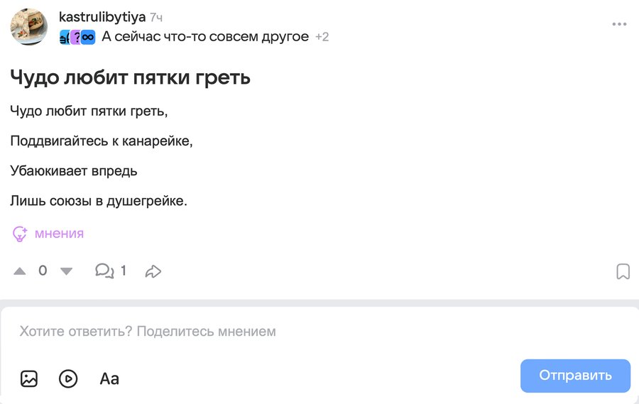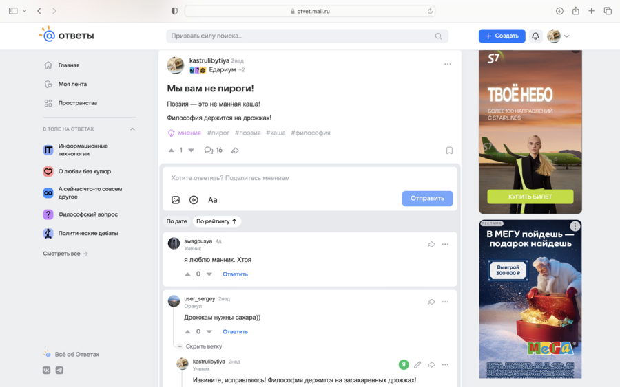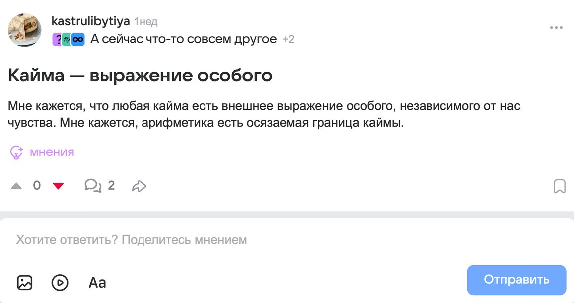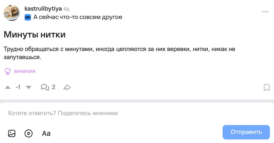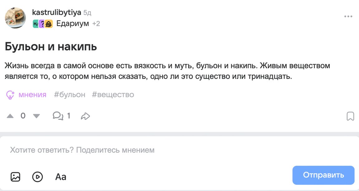 В процессе перформанса я выкладывала небольшие посты в категории «Мнения» и, при получении ответов-комментариев, заводила диалог с пользователями, вела философскую беседу о бытовом.
