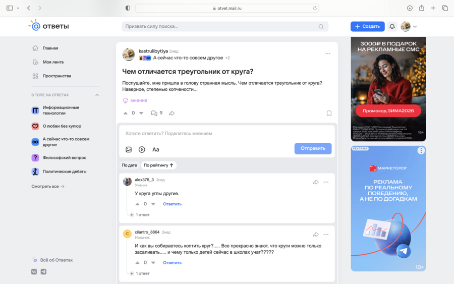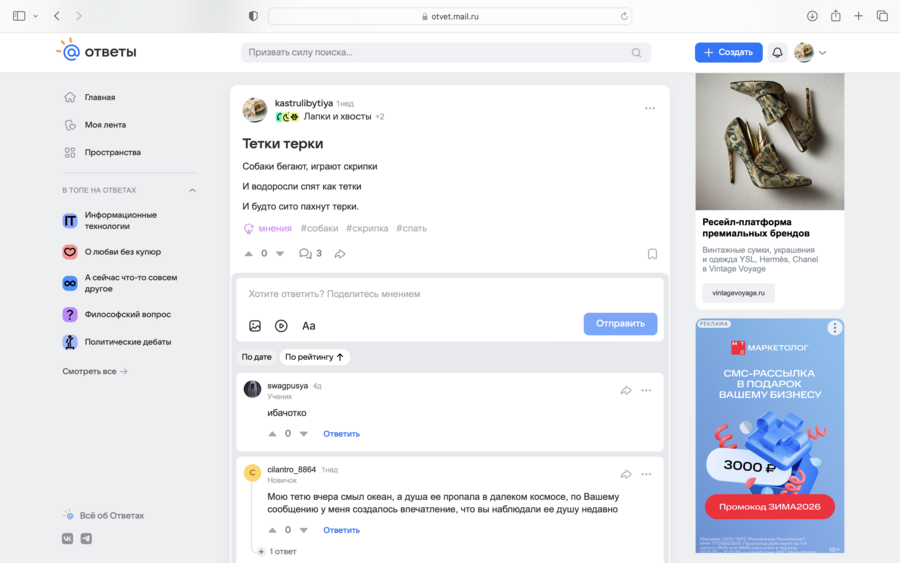 В форум ответы mail — пространство тотального бессмыслия — я ввожу бо́льшую бессмысленность, комбинируя высказывания обэриутов об этом феномене с абсурдными вставками о бытовом и простом.