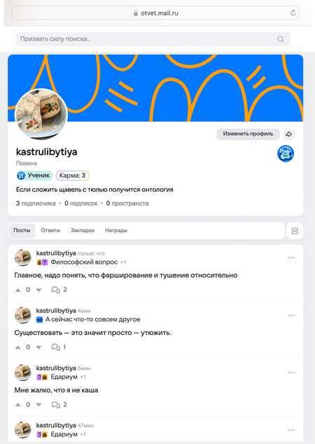 Цифровой перформанс «@kastrulibytiya» проходил на платформе ответы mail ежедневно в течение месяца. Его документацией является аккаунт на платформе.