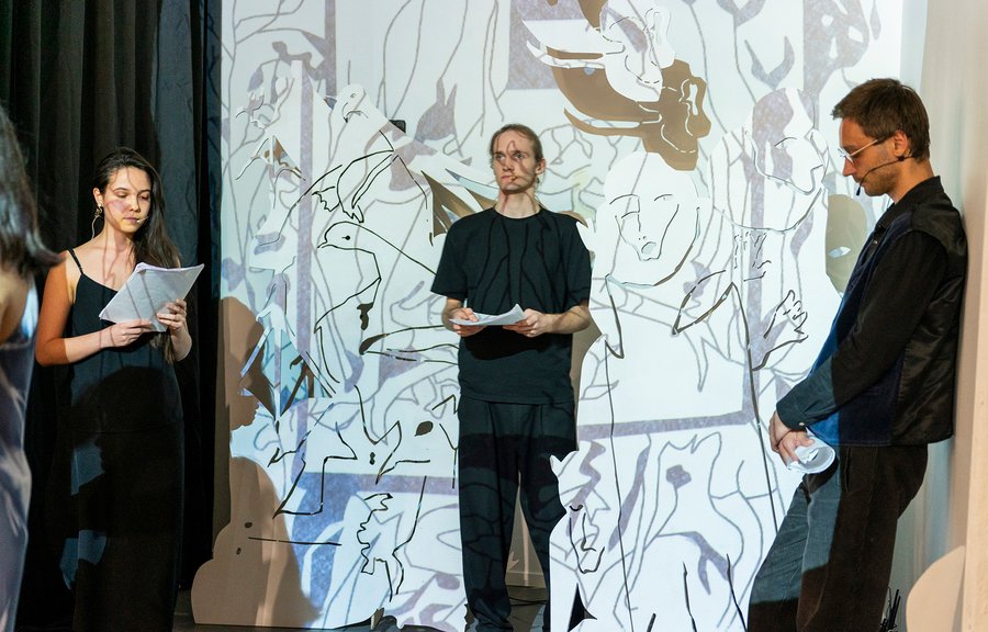 The exhibit is based on the elements of the artist’s archives. The key figure of the style is a man with one of the drawings. It changes its position, thereby adding a dynamic style, and points to important information, with emphasis.