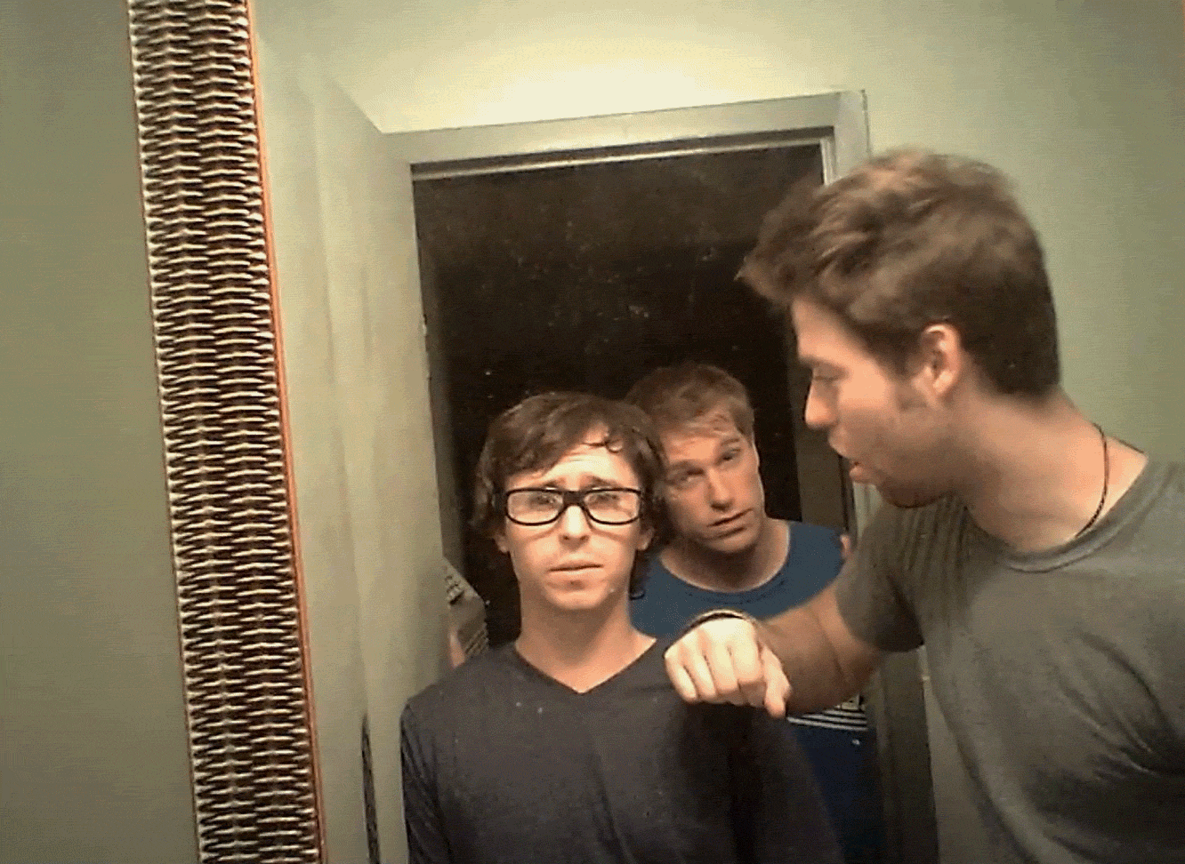 Только зритель видит, что сзади к герою движется фигура. Саспенс в кадрах из фильма «V/H/S» (2012), реж. Гленн МакКвейд