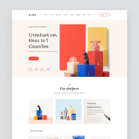 Prompt: Modern website design for a brand «KIRE» selling character-shaped candles. The main background is clean white. Accent colors are bold red, cobalt blue, and vibrant yellow used in buttons, icons, and section dividers. The logo «KIRE» is displayed in a sleek, modern black font at the top.