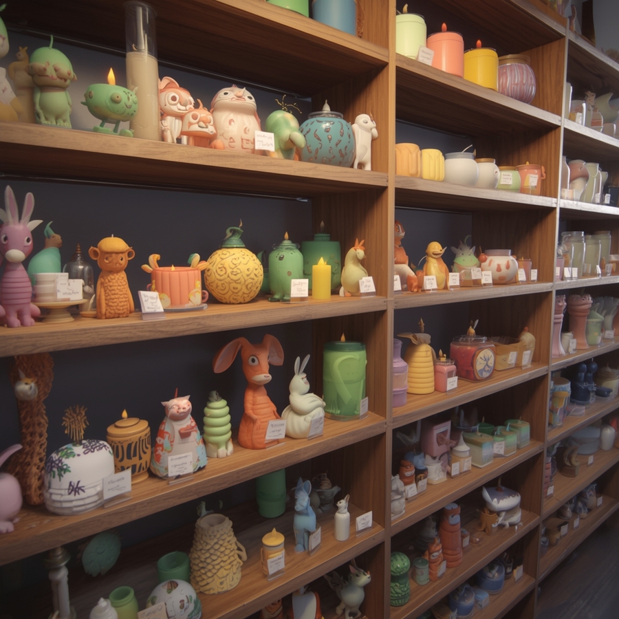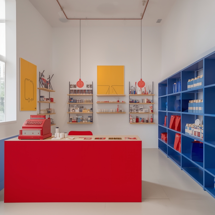 Prompt: photorealistic interior of a small, minimalist candle shop, white walls. A vibrant color palette of primary colors: a bold red counter with a vintage cash register, sleek blue shelving units, and a few yellow graphic posters on the walls. The shelves are filled with products: artisanal candles in various shapes and sizes, red and blue tote bags (shoppers), lighters and matchboxes in shades of red and blue. The space is clean, well-lit by natural light from a large window, creating a warm and inviting atmosphere. Wide-angle shot, style of modern interior design photography.