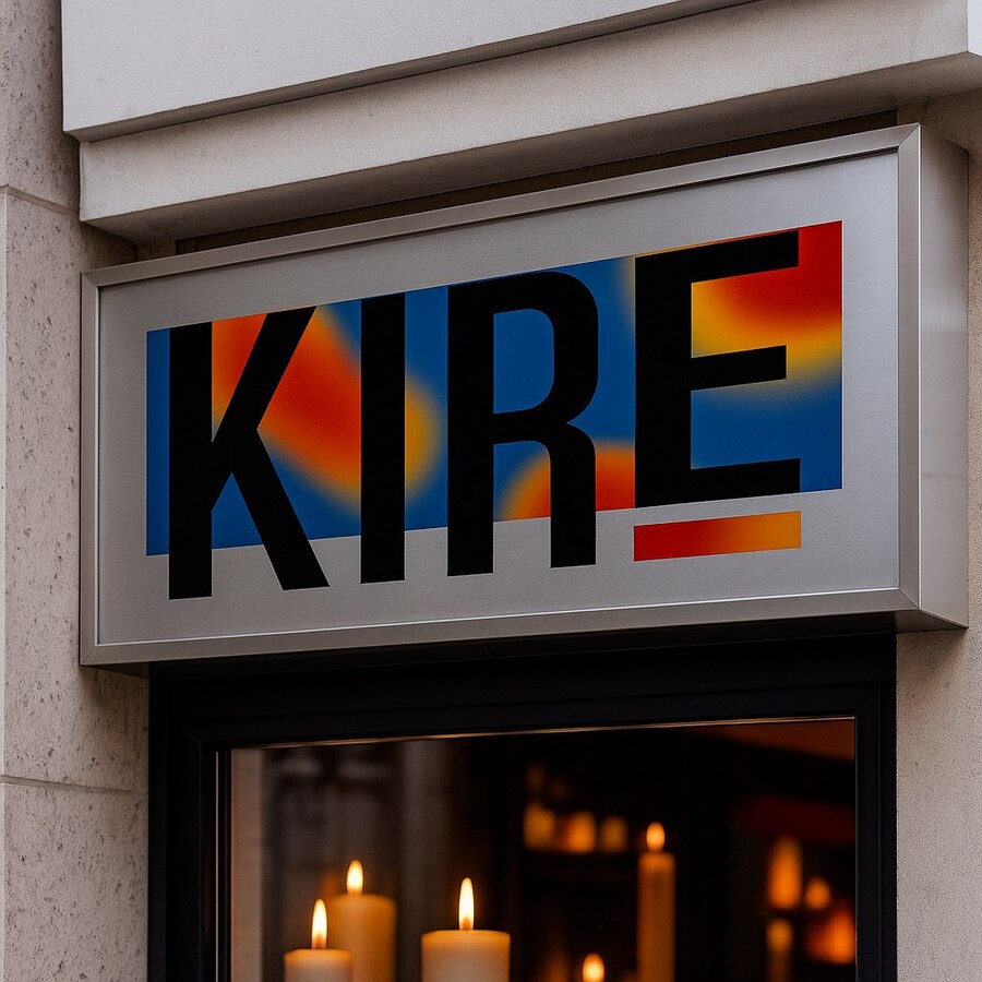 Prompt: Minimalist logo for «KIRE» unusual character candles shop. Features a stylized candle flame that transforms into a playful character silhouette. The design uses a bold, modern serif font for «KIRE» in solid black. Color palette: vibrant red, deep blue, and warm yellow-orange gradients. Clean, professional badge logo, vector style, trending on Behance. --style raw