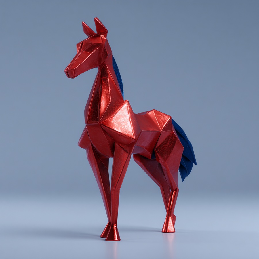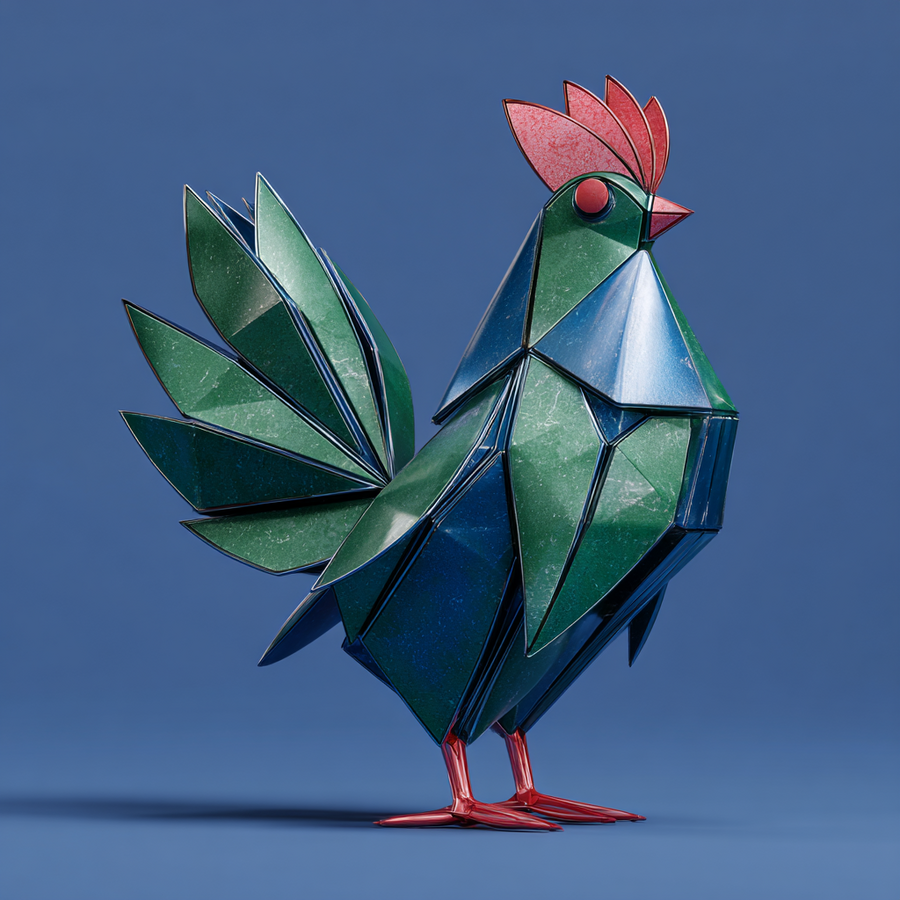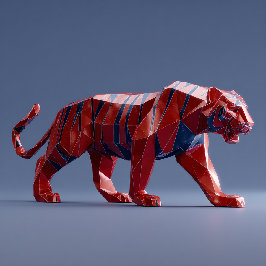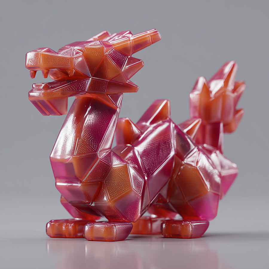 Промпт: «'Name of the animal' interior toy inspired by Russian avant-garde and cubism, made of orange glossy plastic, stylized realistic 3D render, only sharp and rough edges, toy-like proportions. Glossy material with minimal details, gentle cold lightning»