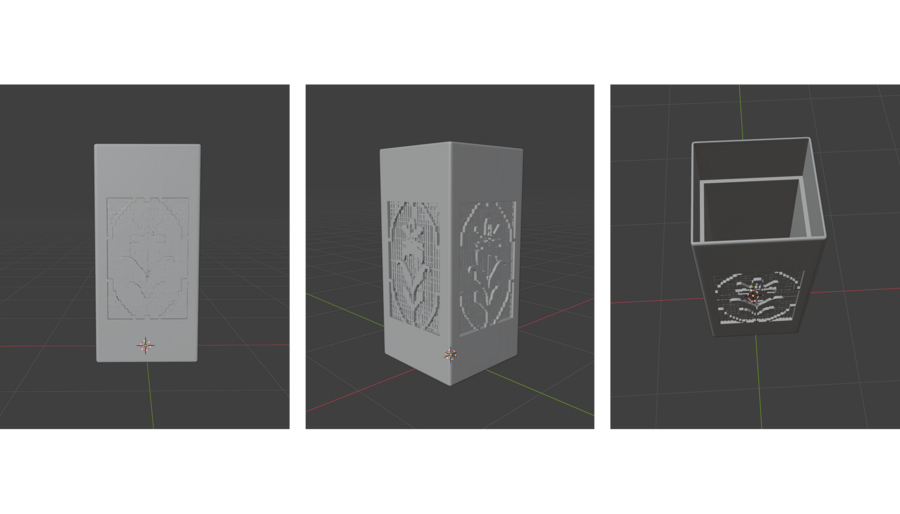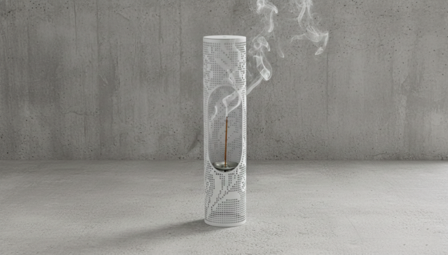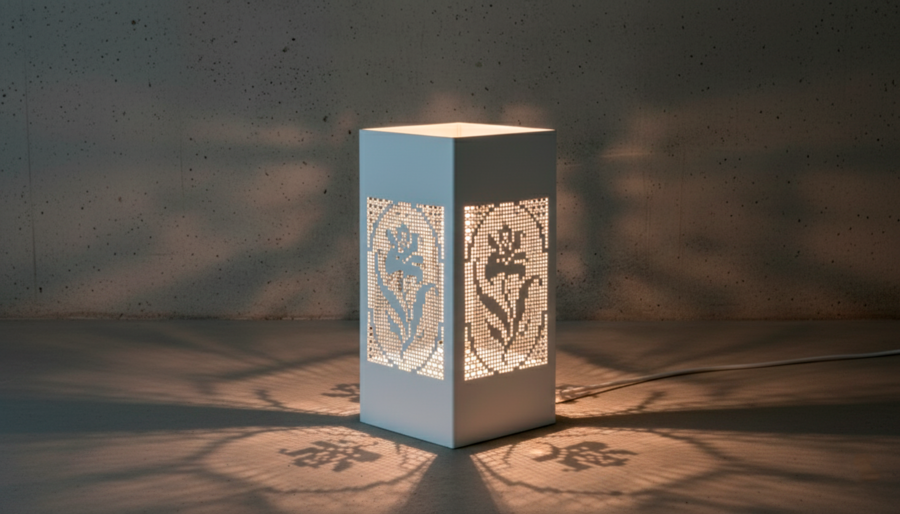 Пример промпта: Design a modern minimalist table lamp based on the attached references. Use the lace pattern diagram from 2 image strictly as a through-cut perforation in the metal surface — the pattern must be fully cut through the metal. Pattern covers each side of the lamp from top to bottom. The top of the lamp is open, light passes from it. The lamp body is a solid, monolithic metal volume with architectural geometry, inspired by modernist and brutalist design and perforated metal furniture. Material: white metal suitable for 3D printing, with thick, consistent wall thickness and structurally sound perforation. Lamp and ornament made of the same material, avoid different colors and materials. Avoid ultra-thin details, fragile bridges, or decorative filigree. The lace-inspired perforation functions as a light filter: soft light passes through the cut-out pattern, creating subtle light and shadow without decorative excess. The aesthetic combines domestic lace motifs with raw industrial modernism — serious, restrained, high-end interior object for contemporary spaces. Realistic, manufacturable design for metal 3D printing, clean edges, precise geometry. Professional studio product photography on a concrete background, high resolution, sharp focus, soft controlled lighting.