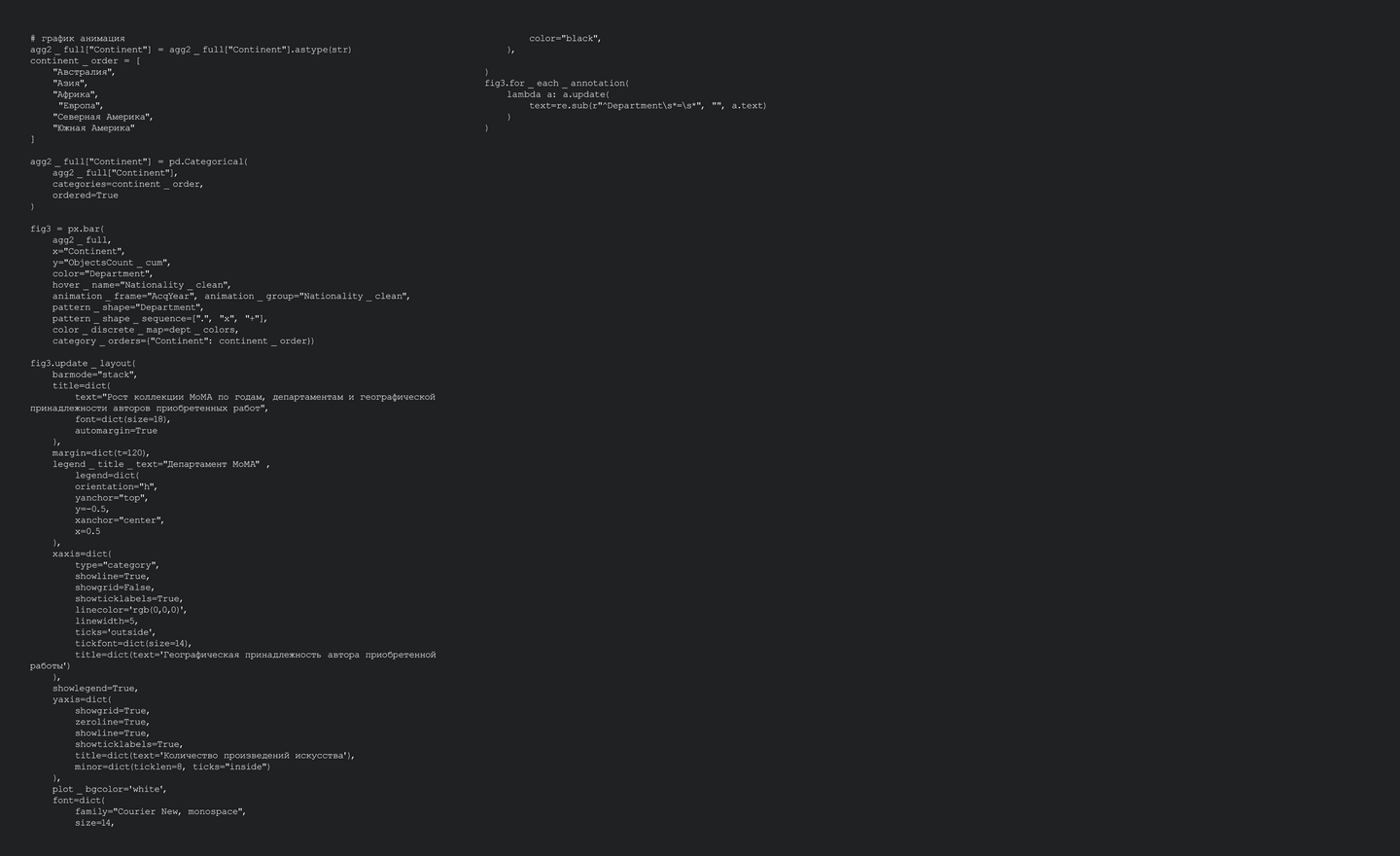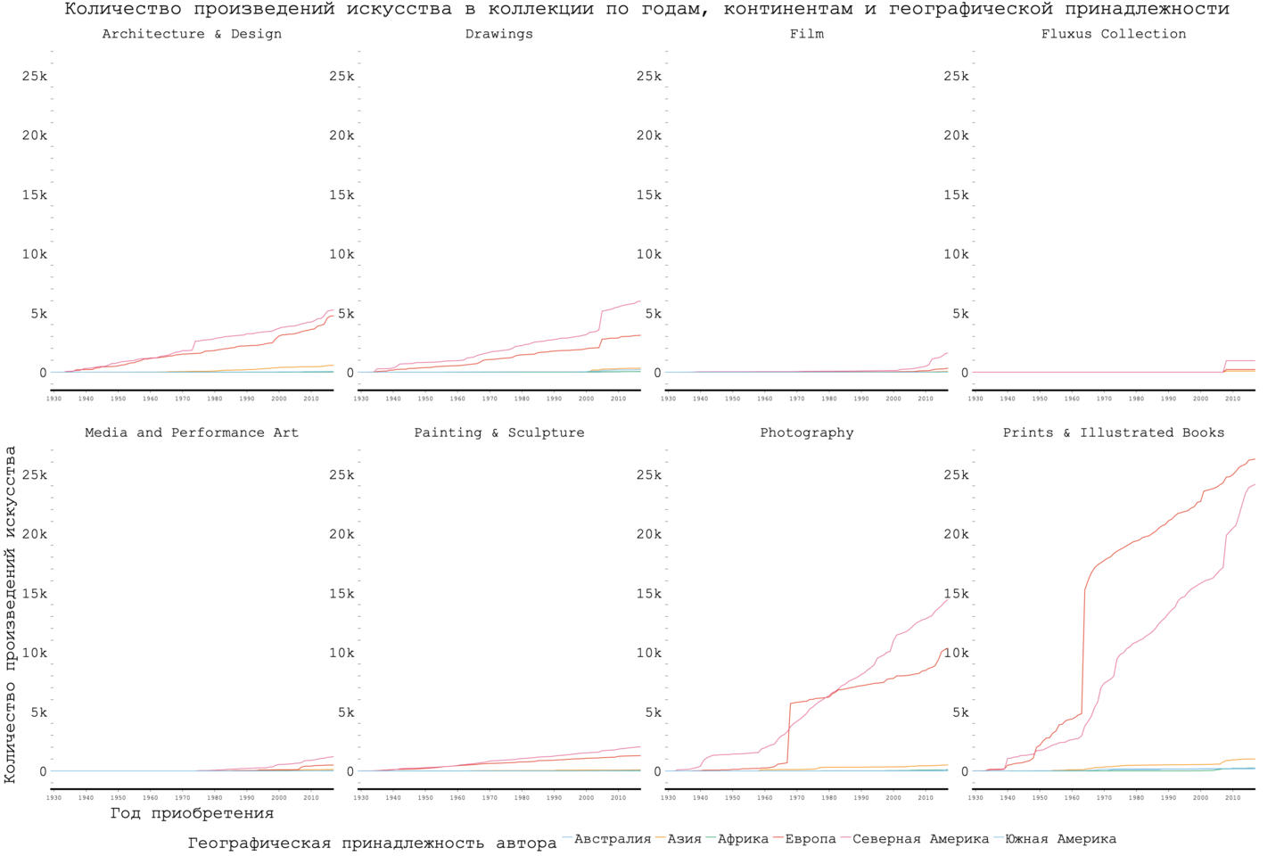 Вероятно, исторически МоМА был ориентирован на европейское и североамериканское искусство модернизма, поэтому именно эти регионы доминируют по количеству работ. Более интенсивный рост работ из Азии, Африки и Южной Америки в последние десятилетия может отражать смену кураторской политики — попытку сделать коллекцию более глобальной и репрезентативной. Кроме того, в некоторых департаментах наблюдаются резкие «скачки» (особенно в фотографии и печатной графике), что похоже на крупные закупки или единовременного получения большого количества работ в дар.