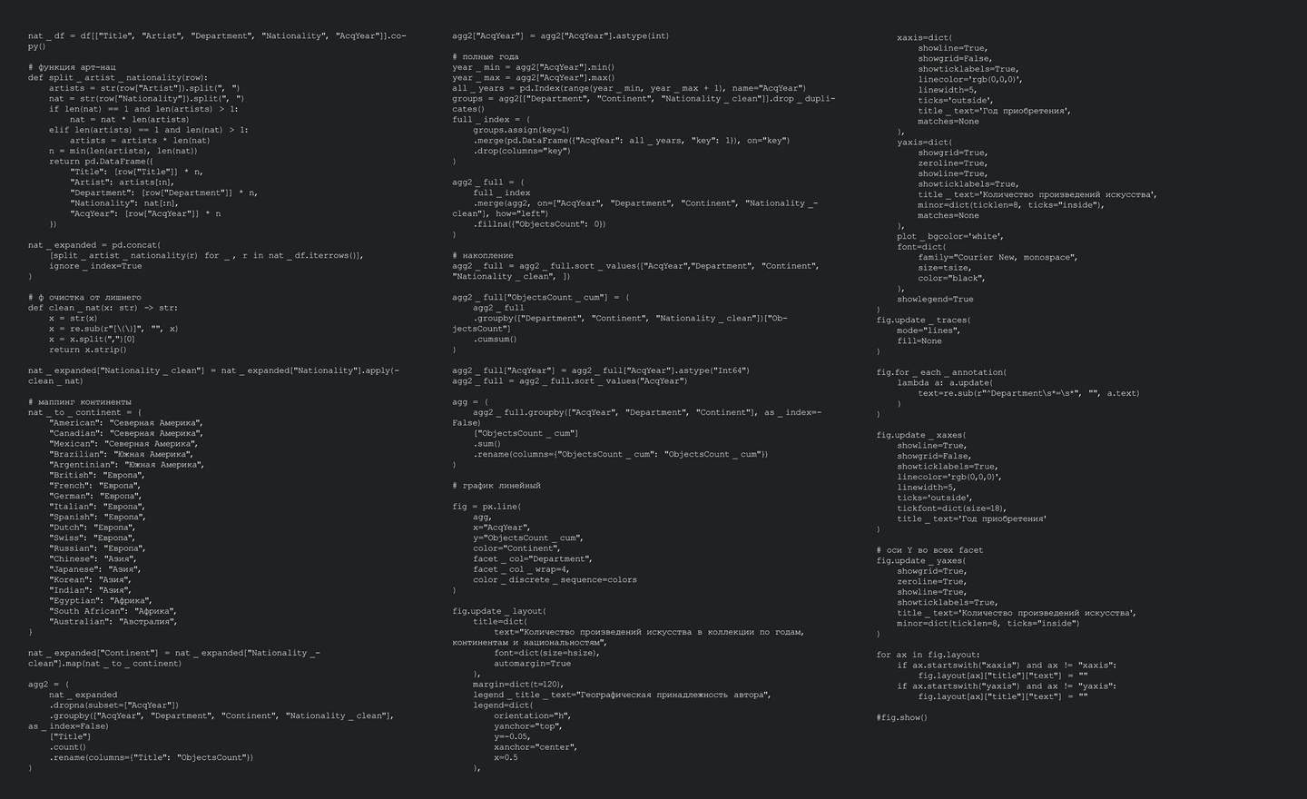 C целью сокращения временных затрат на визуализацию данных часть кода была создана с использованием нейросети Perplexity: - функция разделения строк Artist и Nationality - маппинг континентов и Nationality - распространение стиля оформления на все графики