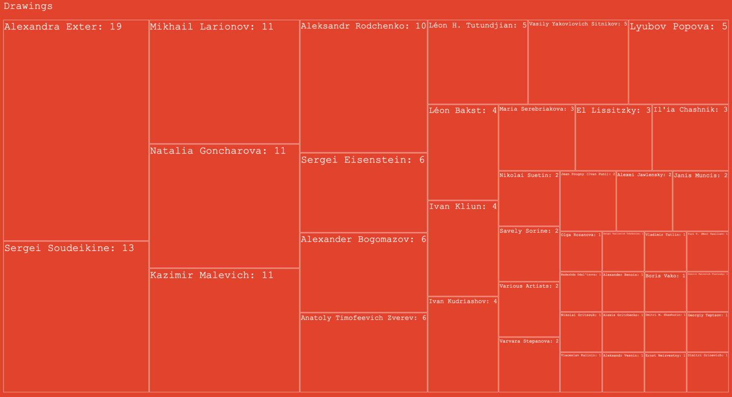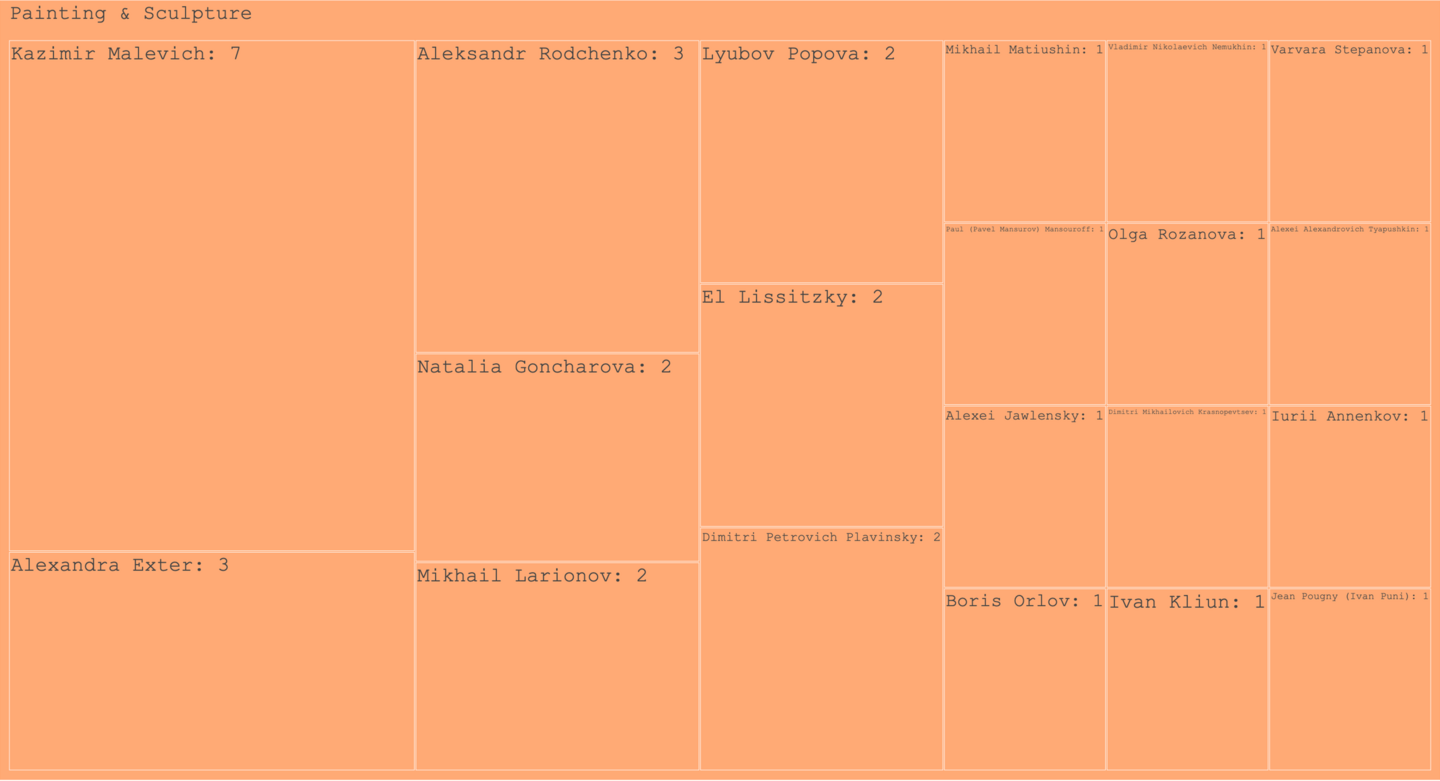 Больше всего работ сосредоточено в департаментах принтов и иллюстрированных книг, рисунков, архитектуры и фотографии, где по объему явно лидирует несколько ключевых авторов — авангардисты и мастера эстампа. Возможно, что музей целенаправленно собирал их тиражные работы и серии. В департаментах живописи, фильмов, медиаискусства российских произведений заметно меньше, что может быть связано с более эпизодическими закупками и меньшим интересом к российскому искусству в этих направлениях. Судя по наиболее «объемным» авторам, наиболее интересны музею авангардисты (Александр Родченко, Эль Лисицкий, Каземир Малевич, Ольга Розанова, Александра Экстер и т. д.), что представляется логичным с точки зрения ретроспективы развития модернизма и влияния авангарда того времени на современное искусство.