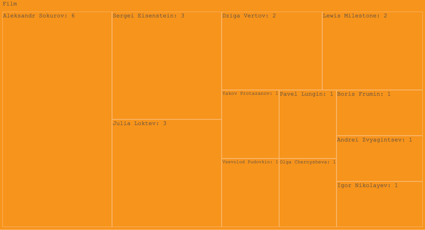 Примечательно, что большая часть работ департаменте «Film» (Фильм) не имеют в датасете идентифицированного автора (10,3%), среди идентифицированных по объему лидируют работы Джона Хабли (John Hubley) — 1,6% от общего числа работ. Возможно, такой высокий уровень отсутствия данных по департаменту связан с недостаточной оцифрованностью департамента, т. к., например, авторы не указаны у работ с известными авторами, такими как «Marey and Demeny Chronophotographs» (авторы — Этьен-Жюль Маре и Жорж Демени), «The Nutty Professor storyboards» (как указано на сайте MoMA, автор — John Lauris Jensen). С другой стороны, в отношении фильмов и сопутствующих им объектов (той же раскадровки) может быть сложно однозначно определить автора с учетом коллективности работы — режиссера, сценариста и других членов команды.