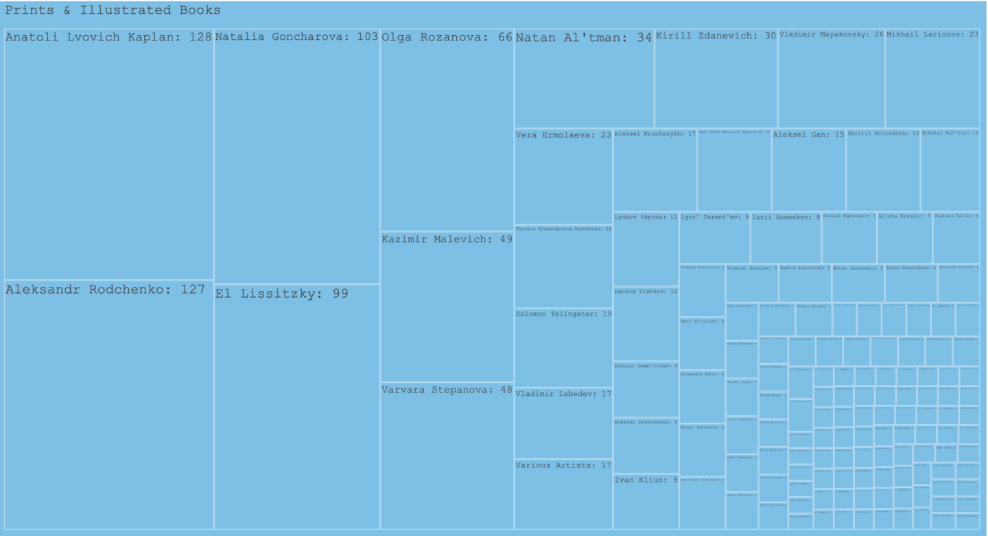 Такое распределение, вероятно, связано с поступлением в музей крупных архивов работ отдельных авторов, а также с относительной простотой создания печатной графики и иллюстрированных книг, фотографий, архитектурных чертежей (по сравнению, к примеру, со скульптурой, живописью), и, соответственно, большим количеством хранимых работ отдельных авторов.