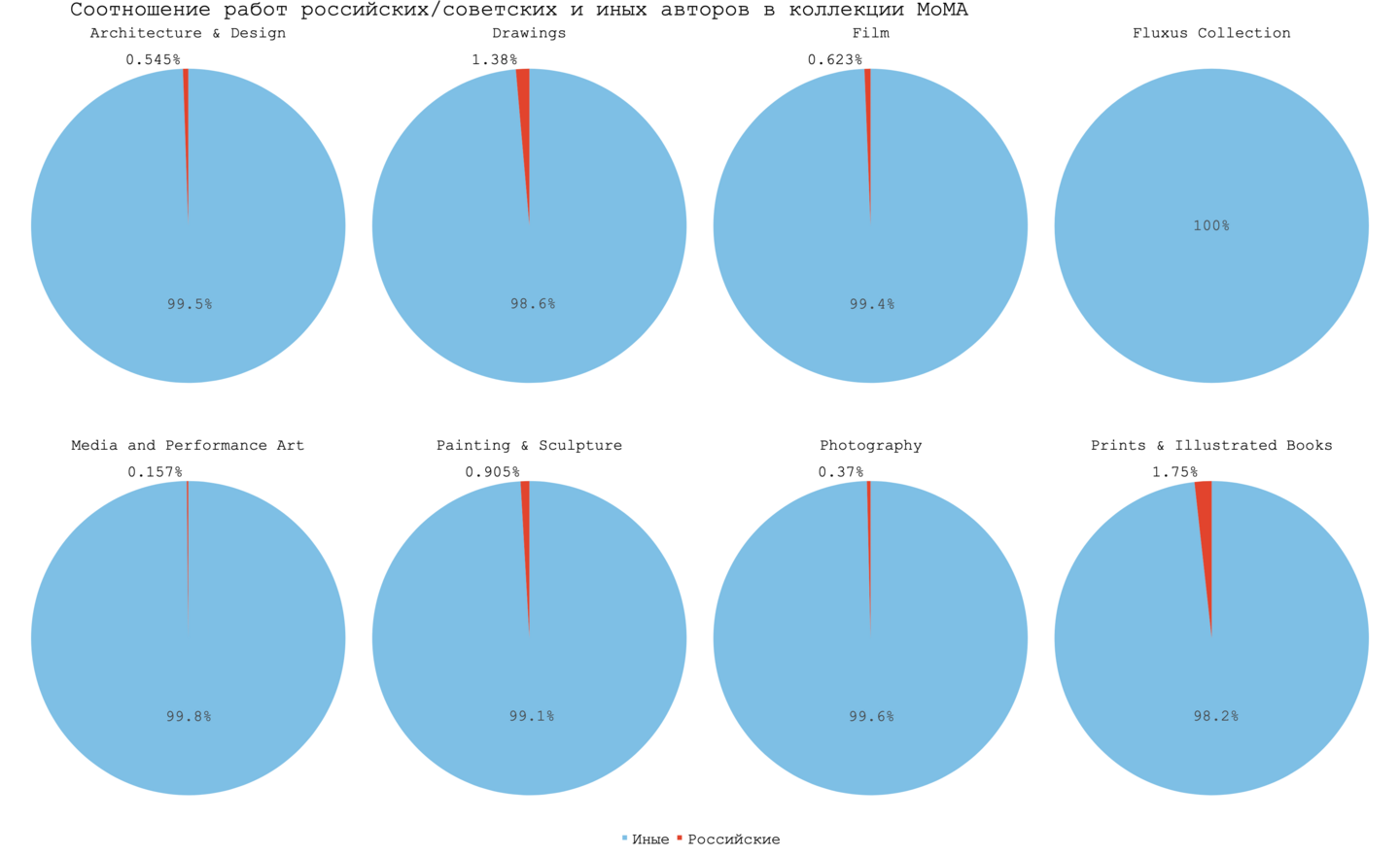 Во всех департаментах российские/советские авторы представлены в объеме не более 2% от общего числа работ. Это может быть связано как с незаинтересованностью в них музея, так и с политическим контекстом XX века — железным занавесом, сложностью обмена, что делало рынок советского искусства закрытым и неизвестным для мирового сообщества, кроме того сводило к минимуму возможность получения большого числа произведений российских авторов американским музеем. В департаменте «Fluxus Collection» российские/советские авторы не представлены, что кажется логичным, т. к. в движении не принимали участие российские/советские художники.