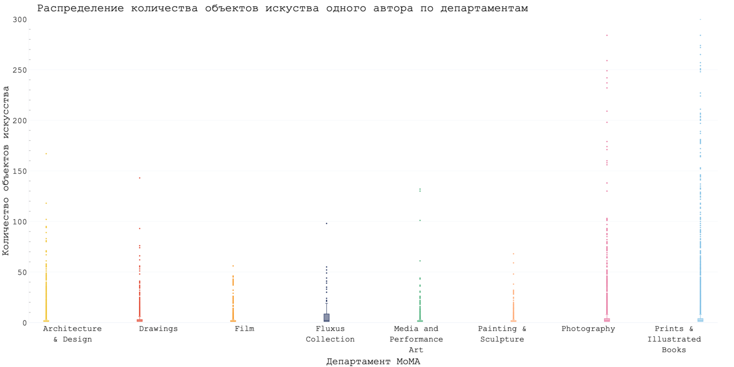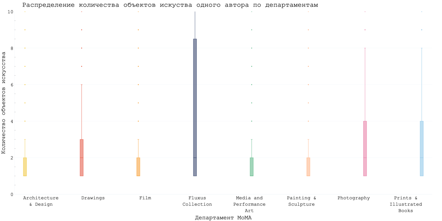 Значит, в большинстве случаев в коллекции представлены единичные работы деятелей искусства. В наиболее «объемных» департаментах при этом наблюдается большое число выбросов — крупных коллекций одного авторов. К примеру, в департаменте «Photography» хранится 3 002 работы Эжена Атже.