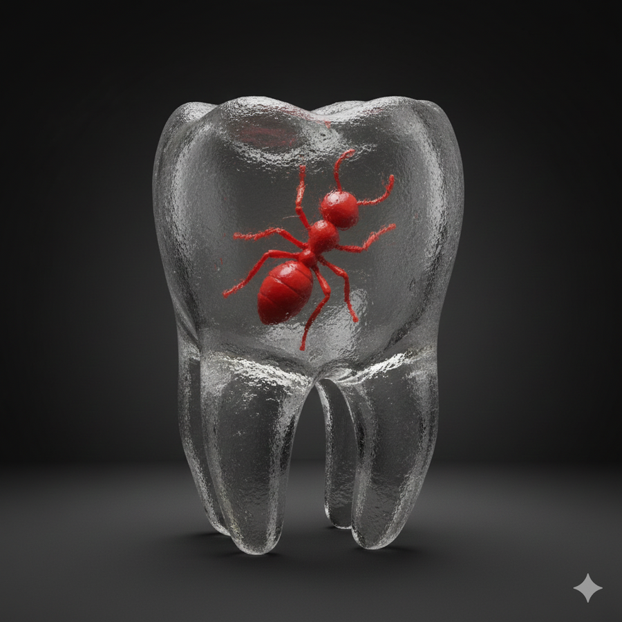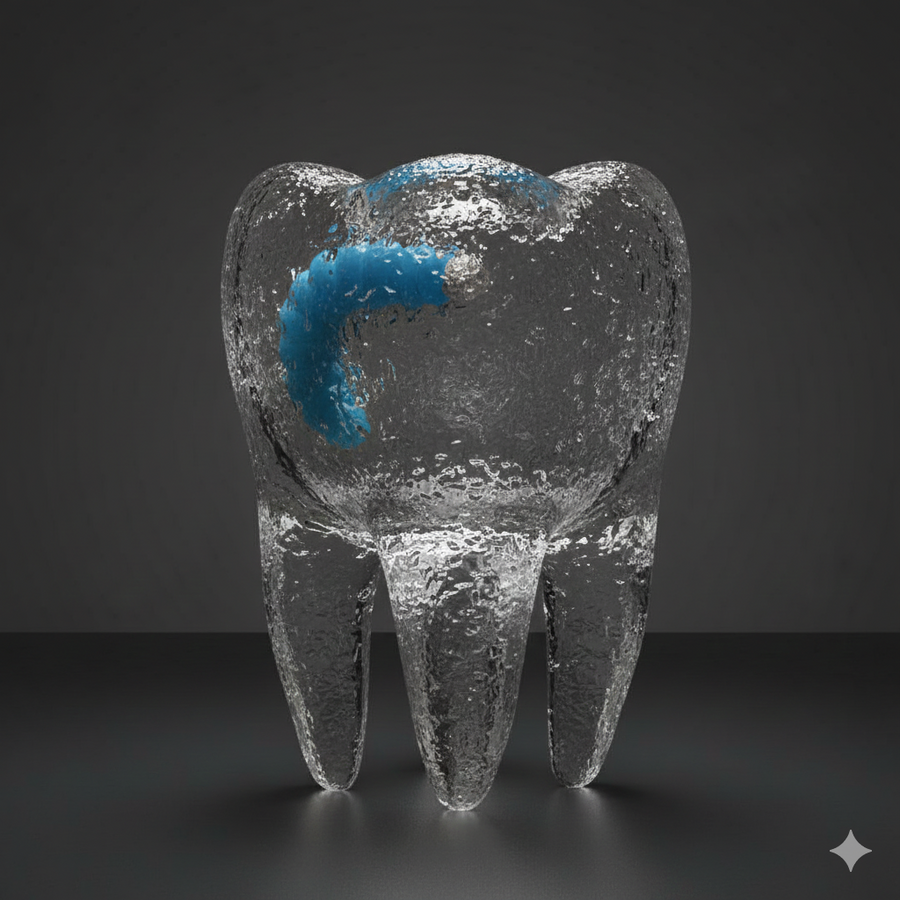 Я продолжила генерировать в Gemini с теми же референсами, меняя промпт. Он несильно изменился: { «action»: «image_generation», «action_input»: «a single figure object consisting 3 irregular, anatomically accurate, and slightly 'ugly' human molar teeth. The figure is made of translucent, heavy frosted glass with a rough, matte, and pitted texture. Outside the thick glass walls of the teeth, there’s a one very portruding 3d glass looking blue catterpillar. The shape is crooked and imperfect, featuring long, uneven roots that act as the base. The lighting is moody and raw, highlighting the grunge-style imperfections and internal entrapment. No text.» }v