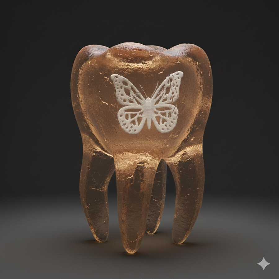 Придумав центральный образ серии предметов (а именно полупрозрачный зуб), я начала разрабатывать идею в Gemini, используя референсы и промпт «{ „action“: „image_generation“, „action_input“: „An irregular, anatomically accurate, and slightly 'ugly' human molar tooth shaped vase. The vase is made of translucent, heavy frosted glass with a rough, matte, and pitted texture. Inside the thick glass walls of the tooth, a small, detailed butterfly is suspended and preserved, similar to an insect trapped in amber. The shape is crooked and imperfect, featuring long, uneven roots that act as the base. The lighting is moody and raw, highlighting the grunge-style imperfections and internal entrapment. No text.“ }v».