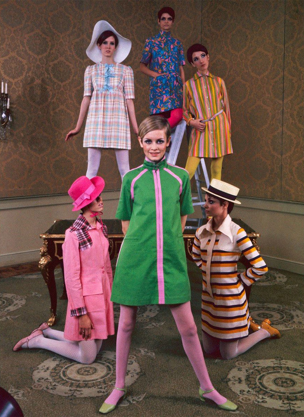Андрогинность и унисекс-силуэты. Прямые линии, отказ от выраженной талии. Значимой фигурой в этом вопросе была Твигги — ее хрупкое, «мальчишеское» телосложение и короткие стрижки стали иконой новой женской эстетики и помогли популяризировать унисекс фасоны.