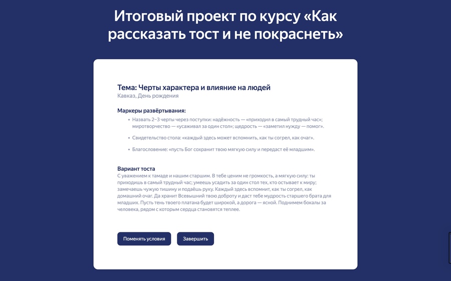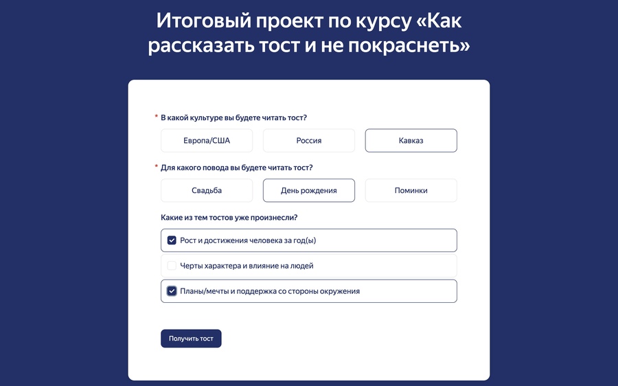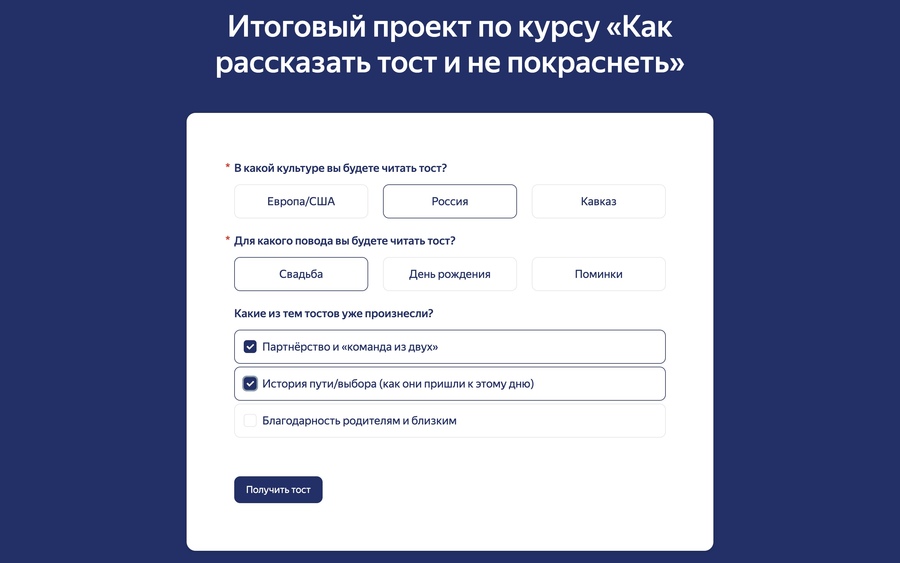 Конструктор тостов представляет собой интерактивную форму, которая по трём ответам выдаёт готовую заготовку для ритуальной речи.