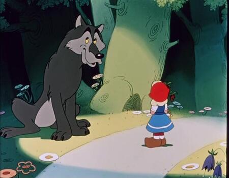 Красная Шапочка отправляется в путь, а Волк спешит за ней. Он использует хитрость, чтобы проникнуть в доверие к маленькой девочке, которая прекрасно знает, что злой хищник способен уволочь ее в тёмный лес. Но Волк, маскируясь в безобидного козла, чью шкуру он надел (явно отсылая к фразе «волк в овечьей шкуре»), всё же осуществляет свой план и увозит Красную Шапочку на себе в лес.