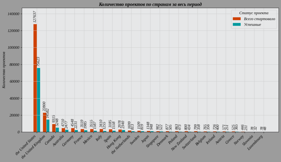 Построен график количества проектов по странам за весь период. Отчетливо виден бум проектов в США. Даже страны-саттелиты очень сильно от них отстают.