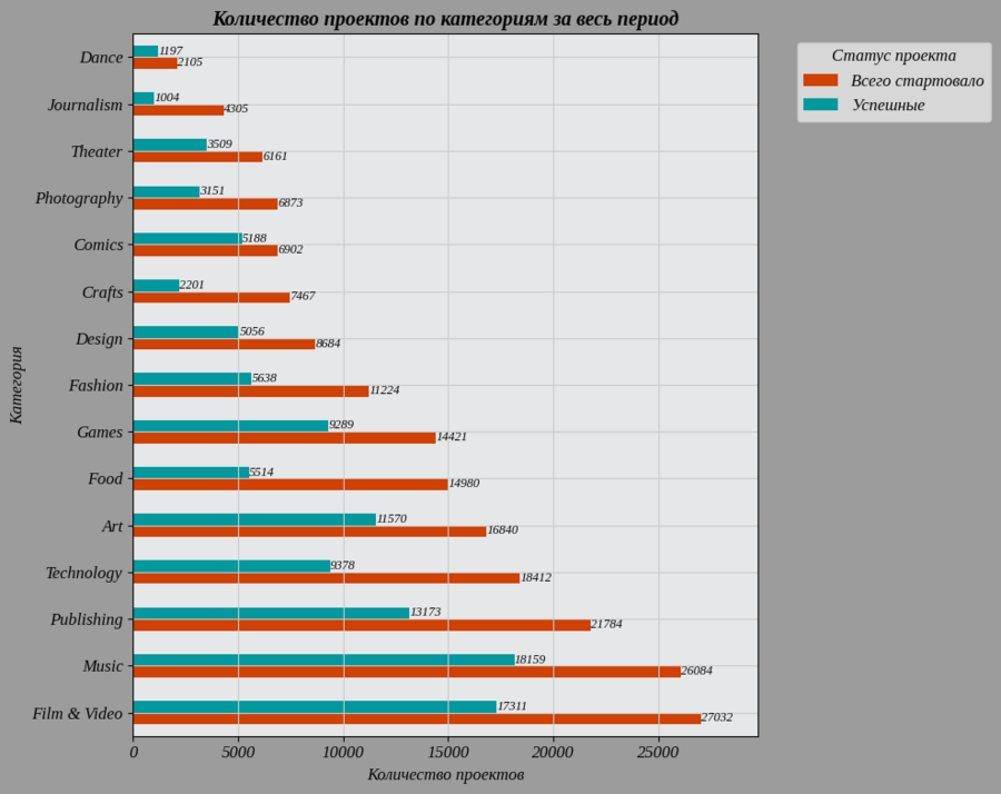 Построен график количества стартовавших и успешных проектов по категориям за весь период. Наибольшее количество категорий проектов относится к сфере развлечения и потребления. Также сильно развивается технологическая категория, как база для развития остальных категорий.