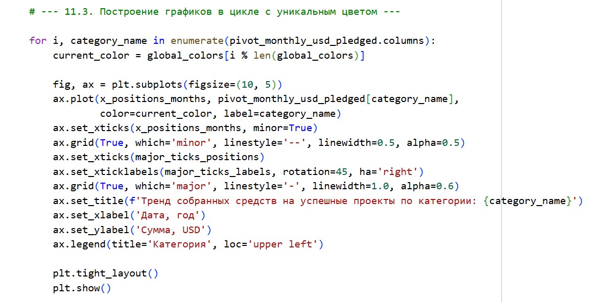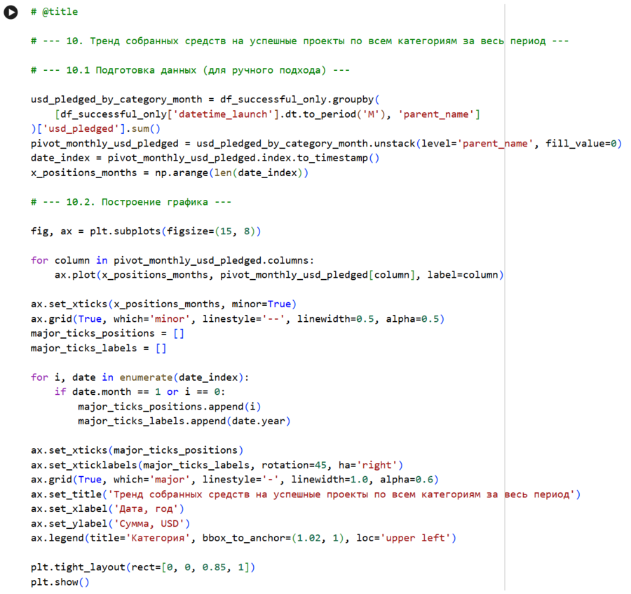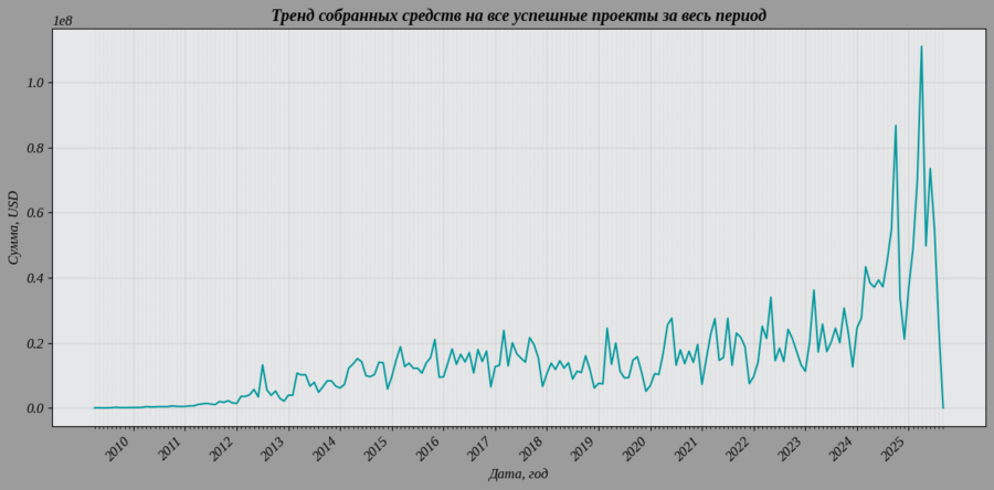 Построен график тренда собранных средств на все успешные проекты за весь период. Рост сбора средств обеспечивает рост количества проектов.