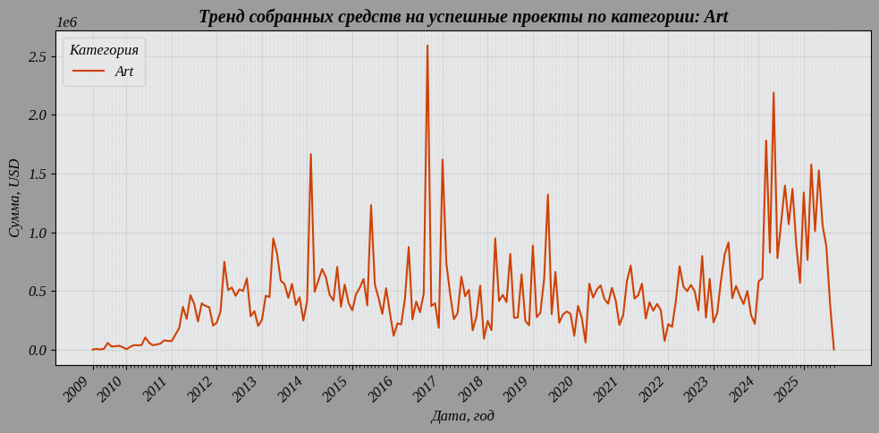 Построен график тренда собранных средств на успешные проекты по всем категориям за весь период. Среди всех категорий есть очень капиталоемкие категории. Подробнее категории рассмотрены далее.