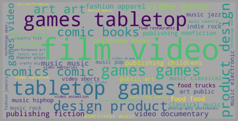Построено облако слов, состоящее не только из категорий успешных проектов, но и из их подкатегорий.